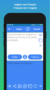 1 EngFreEng  application de traduction de l39anglais vers le franais et application de traduction du franais vers l39anglais Traduisez facilement du texte anglais vers le franais l39aide de notre application gratuite Traducteur de l39anglais vers le franais Vous pouvez galement effectuer un traducteur franais vers anglais Grce la technologie de reconnaissance vocale intgre vous pouvez saisir votre texte l39aide de votre voix puis traduire le texte Cette fonctionnalit pratique vous permet de traduire des conversations rgulires Vous pouvez traduire votre voix anglaise en franais et votre voix franaise en anglais Grce la fonctionnalit vocale intgre vous pouvez couter des mots ou des phrases Cliquez sur le hautparleur et l39application lira des mots/phrases en anglais L39application lira galement des mots/phrases franais Utilisezle comme dictionnaire Vous pouvez taper vos mots en anglais et obtenir le mot exact en franais Vous pouvez taper vos mots en franais et obtenir le mot exact en anglais Guide d39utilisation 1 J39ai copi un texte comment puisje le traduire  A Cliquez sur le bouton  Coller  et notre application Traducteur anglais vers franais traduira le texte 2 Comment changer de langue  A Cliquez sur le bouton d39change 2 flches en haut de l39cran Cliquer sur le bouton d39change change le sens de la traduction entre  anglais vers franais  et  franais vers anglais  3 Je veux dire du texte et le traduire  A Cliquez sur le bouton  Mic  et prononcez le texte Une fois que vous avez termin la saisie vocale cliquez sur Traduire et l39application Traducteur anglais vers franais traduira le texte 4 Comment puisje l39utiliser comme traducteur anglais vers franais  A Entrez le texte dans la premire zone de texte et cliquez sur Traduire et notre application traduira votre texte anglais en franais 5 Comment puisje l39utiliser comme traducteur du franais vers l39anglais  A Cliquer sur le bouton  changer  change le sens de la traduction Une fois que vous avez dfini la direction du franais vers l39anglais saisissez le texte dans la zone de texte suprieure et cliquez sur Traduire pour traduire du franais vers l39anglais Caractristiques de l39application de traduction de l39anglais vers le franais  1 Convertisseur anglais vers franais / Traducteur anglais vers franais 2 Convertisseur franais vers anglais / Traducteur franais vers anglais 3 Saisie vocale en anglais Traduction vocale de l39anglais vers le franais 4 Saisie vocale en franais Traduction vocale du franais vers l39anglais 5 Partagez facilement le texte traduit avec d39autres applications 6 Partagez en un clic le texte traduit sur WhatsApp ou FB Messenger 7 Dictionnaire anglais vers franais ou dictionnaire franais vers anglais 8 Consomme trs moins de mmoire 9 Super rapide L39application de traduction anglais vers franais utilise les autorisations cidessous  1 Accs au stockage  sert stocker l39historique du traducteur anglais vers franais et du traducteur franais vers anglais Merci d39utiliser notre application Traducteur anglais vers franais  conseil de pro  vous pouvez galement utiliser cette application comme application de traducteur du franais vers l39anglais Pour tout problme/requte/commentaire/suggestions concernant notre application de traduction anglais vers franais veuillez nous contacter supporthoneyshacom nous serons heureux de vous contacter