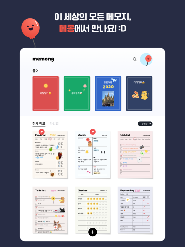 메몽은 메모를 사랑하는 풍선이에요.메모를 이롭게 할 이쁜 메모지들과 귀여운 스티커들을 창조했어요.간단 메모부터, 데일리플랜, 위클리플랜, 지출기록, 위시리스트, 투두리스트, 식단플랜까지-!하나씩 정리하다보면 나의 하루하루가 더 소중하게 느껴질꺼에요.메몽과 함께 폰에서도 기록하는 즐거움을 느껴보세요! :D메몽은- 12가지 기능성 메모지가 있어요- 폴더를 생성하고 메모를 정리할 수 있어요.- 글자 컬러 변경과 볼드, 형광펜 효과등을 사용할 수 있어요.- 메모지 위에 사진은 물론 약 600개의 다양한 스티커를 사용해 꾸밀 수 있어요.- 아이클라우드 백업 기능을 지원해요.- 위젯 기능을 지원해요.- 중요한 메모는 상단에 고정할 수 있어요 - 검색 기능을 지원해요.- 아이패드 버전을 지원해요.* 원하는 기능이나 제안사항이 있으시면2hoursstudio@gmail.com 으로 메일보내주세요!메몽은 언제든지 여러분의 의견을 기다립니다.
