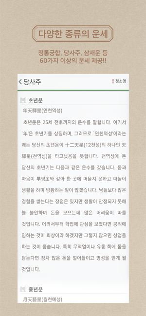 **토정비결,신년운세,월별운세,삼재운은 좌우로 슬라이드하여 과거 미래의 운세를 확인할 수 있습니다.****본인,가족, 친구 등의 운세를 보는데 있어 최적의 인터페이스****서버방식이 아니라 회원가입이 없으며, 어떠한 개인정보를 저장하지 않습니다.****모든 운세는 평생 보실 수있으며, 기간제한이나 인원제한이 없습니다.**▷▶운세구성- 오늘의 운세매일 총운,애정운,재물운,건강운,방향운,코디운,음식운 등 7가지 오늘의운세 무료 제공- 오늘의 재수떼기정전역해 즉석점을 통해 오늘의 점괘 무료 제공- 꿈해몽15,000개 이상의 방대한 꿈해몽 데이타를 모두 담아놓은 명품 꿈해몽 무료 제공- 월별운세(좌우로 슬라이드하여 이전달 다음달 월별운세를 볼 수 있음)매월 총운,애정운,금전운,이달의변화,이달의 인간관계,건강운,주의사항 등 8가지 명품 월별운세- 토정비결(좌우로 슬라이드하여 작년 내년 토정비결을 볼 수 있음)올해는 물론 과거, 미래의 토정비결을 토탈 서비스로 제공하며, 총평/현대적풀이/월별운세 등의 방대한 분량의 내용이 제공되는 명품 토정비결- 신년운세(좌우로 슬라이드하여 작년 내년 신년운세를 볼 수 있음)올해의 흐름과화두,올해의지침,부자가될까,금전관리,애정흐름 등의 명품 신년운세 - 분석남녀별자리,띠,혈액형,이름 등을 통한 심층적인 분석남녀 무료 제공- 정통궁합인연궁합,애정궁합,재물궁합,결혼궁합,자녀궁합,최종조언 등 다양하고 방대한 분량의 명품 궁합- 당사주총운,초년운,중년운,말년운,성품론,자식운,부부금술운,직업운 등의 정확하게 해석한 명품 당사주- 재미운세별자리,띠,혈액형으로 보는 재미운세 무료제공!!- 삼재운(좌우로 슬라이드하여 작년 내년 삼재운을 볼 수 있음)12년 주기로 3년간 이어지는 삼재운과 상세한 삼재풀이 무료 제공- 성명풀이한글의 수리발음오행을 통한 성명풀이 무료 제공▷▶특징 사용자등록을 통해 자신의 운세 및 가족, 친구들의 운세를 모두 볼 수 있습니다. ▷▶사용방법운세메뉴선택> 사용자추가> 운세결과운세메뉴선택> 가족,친구등의 사용자추가