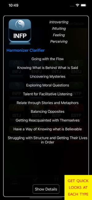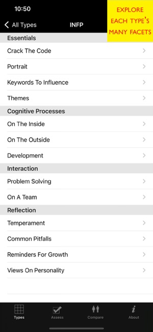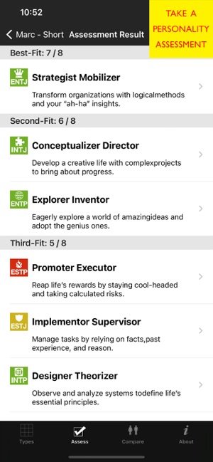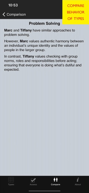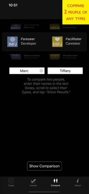 What’s your personality? How do you and your loved ones, friends, and co-workers compare? Imagine having quick access to the right keywords to get your point across!Whether you’re in a boring meeting, on the phone with a challenging client, or dealing with a flustered family member — this application is for you. The essential themes of each personality Type are just a tap away. You can also explore each personality in depth: learn a person’s core needs and values, cognitive processes, interaction style, team behavior, pitfalls, growth points, and much more.You will quickly learn about Type Theory and how to positively influence others using the “Compare” feature. This feature relies on sophisticated algorithms to show you the likely commonalities, differences, and synergies between two people. The algorithms compare communication, problem solving, learning and adaptation, love relationships, growth and change, and more.IN DEPTH:Personality is far more than just superficial traits. Pers