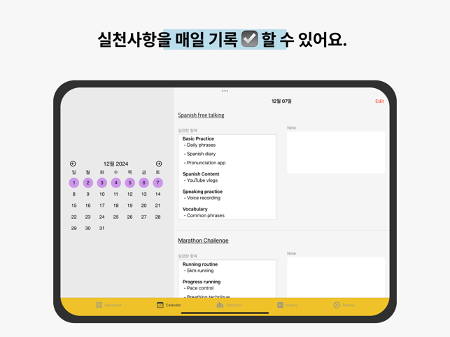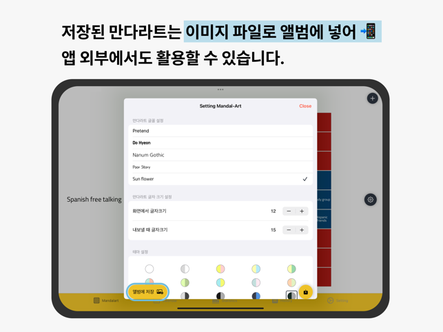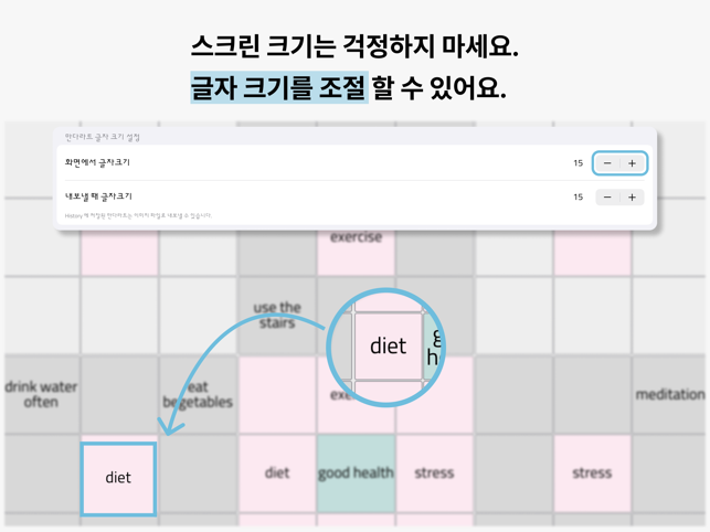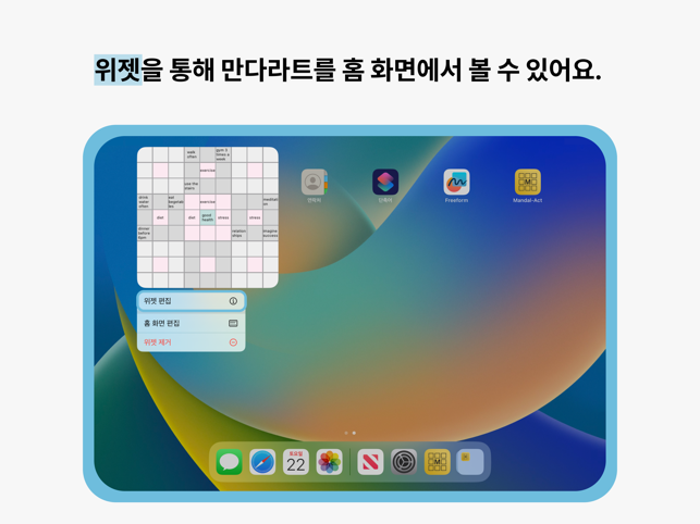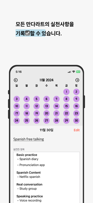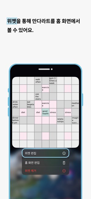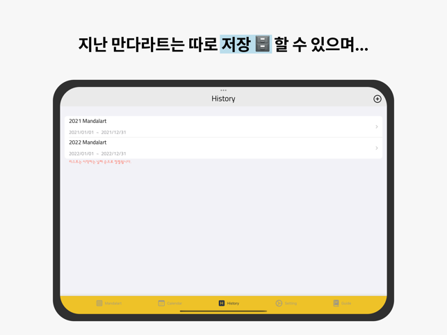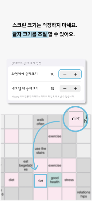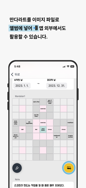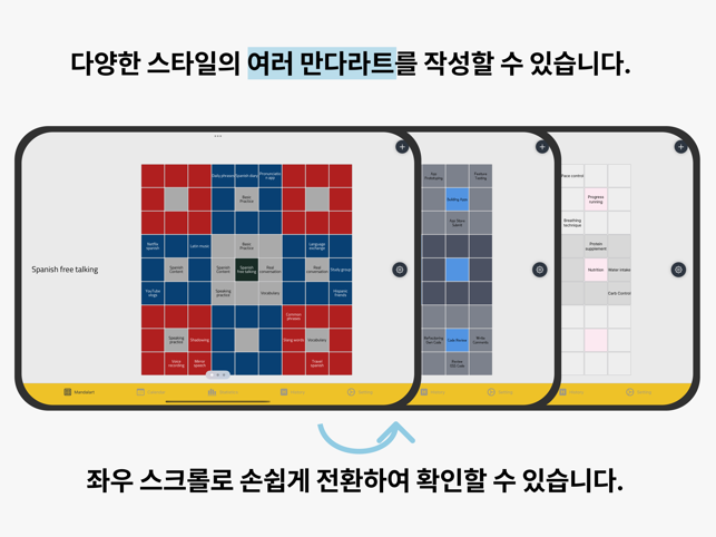 열심히하는 것은 좋지만 왜 해야하는지 목적을 잃는다면 오랫동안 유지될 수 없습니다.목표와 그것에 관련된 것들이 체계적으로 시각화되어 주어지고 목표를 이루기 위한 행동들을 관리할 수 있다면 얼마나 좋을까요?유료앱이니 만큼 설명을 끝까지 읽은 뒤에 구매 여부를 결정해주세요. 만다라트는 핵심 키워드를 중심으로 연관 키워드들을 배치하여 한눈에 볼수 있도록 시각적으로 표현하는 틀입니다.이용자는 중심 키워드로 이루고자하는 핵심 목표를 설정하고 핵심 목표를 위한 세부 목표를 정의하며 각 세부목표 별로 구체적인 행동지침이나 마음가짐을 정합니다. 그리고 이 모든 것을 한눈에 볼 수 있도록 만다라트라는 틀에 배치합니다. [ 구매 정책 ]이 어플은 가입이 필요하지 않으며 구독 정책을 사용하지 않습니다. 한 번의 구매로 이용할 수 있으며 이후에도 앱내구입을 통해 서비스를 차등화하지 않습니다. 업데이트 사항은 모두에게 동등하게 적용됩니다.[ 만다라트 ]이 어플은 만다라트를 작성하는 것으로 시작합니다.만다라트는 가로, 세로 각각 9개의 사각형. 총 81개의 사각형으로 구성됩니다.사각형 각각에 목표와 그것에 관련된 내용들로 채워집니다.정 가운데에는 핵심목표가 들어가며 핵심목표의 주변에는 핵심목표를 구성하는 세부목표가 들어갑니다.외곽은 세부목표를 위한 자리이며 가운데에 세부목표가 들어가고 세부목표를 위한구체적인 행동지침이나 마음가짐 같은 것이 들어갑니다.이 앱에서는 동시에 여러 개의 만다라트를 작성할 수 있습니다. 각 만다라트 별로 독립적인 테마를 설정할 수 있으며, 글씨 크기도 따로 설정할 수 있습니다. [ 기록 ]앱 내부의 달력에 날짜를 터치하면 그 날 했던것을 체크하고 기록하고 싶은 내용을 기록 할 수 있습니다.그리고 기록이 있는 날짜는 달력에 표시가 됩니다. 또한 실천한 항목에 대한 주간 및 월간기록을 확인할 수 있습니다.[ 히스토리 ]이미 완료했거나 더이상 실천하지 않는 만다라트는 그것을 삭제하기 전에 History 에 저장할 수 있습니다. 기존 만다라트를 저장하고 소감을 기록