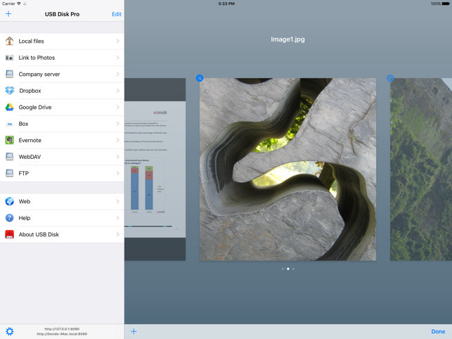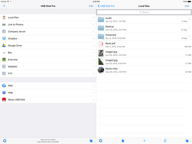 USB Disk Pro lets you store, view and manage documents on your iPhone and iPad. It has an amazing built in document viewer and is very easy to use, with a simple and intuitive interface, yet it contains many powerful features. Drag and drop files in iTunes to transfer them to your iPhone / iPad, then view them anywhere! TUAW - "USB Disk is [...] a nicely designed one."Lifehacker - "The Best. USB Disk for iOS gives you a fast and easy way to transfer documents and images to your device."Apple - "New and Noteworthy"TOP REASONS TO BUY• Store and view files.• Open multiple documents in different pages.• Restores last viewing position.• Navigate using swipes (like Photos / iBooks app).• Thumbnails let you preview your files.• Protect & encrypt files using Apple's Data Protection.• Supports the Files application (file provider for iOS 11+).MORE FEATURES• View and download email attachments.• Full screen file viewer.• Copy, paste, cut, delete and create f