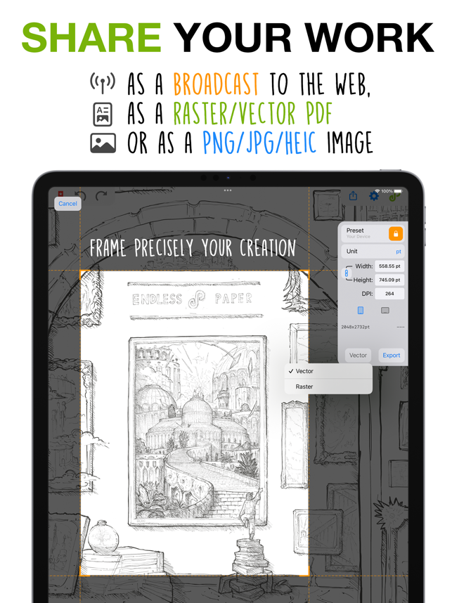 Introducing Endless Paper, an all-new kind of app featuring an infinite canvas which lets you take handwritten notes, create immersive art pieces, explore and grow ideas visually, and so much more…Deliberately simple yet powerful, incredibly fast, Endless Paper is as natural to use as pen & paper without the limitations of physical media.Whether you are a student taking notes, an artist wanting to explore uncharted territories, or a manager brainstorming on your next project, Endless Paper is a versatile tool to help you think and communicate visually.HIGHLIGHTS• A truly infinite canvas• Ultra-crisp drawings at any zoom factor• Create vast and expansive universes while occupying a minimal storage footprint• Generate high-resolution images and PDFs of your canvas• Bookmarks and folders to quickly navigate your canvas• Create multiple canvases in a cohesive gallery, duplicate them and group revisions• Drag and drop pictures, from basically any app, including images with transparency•