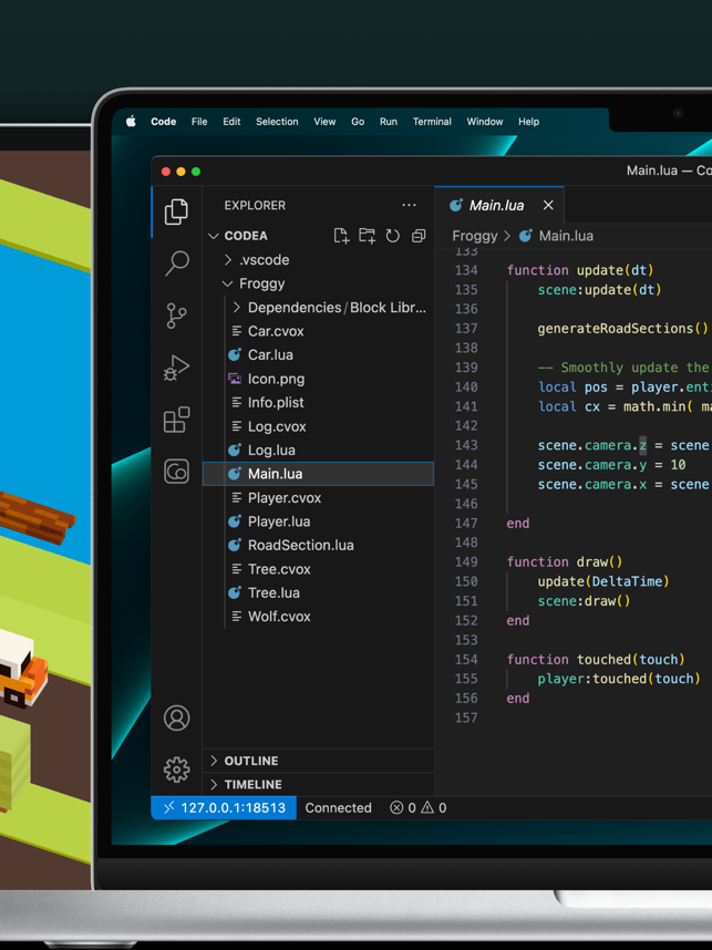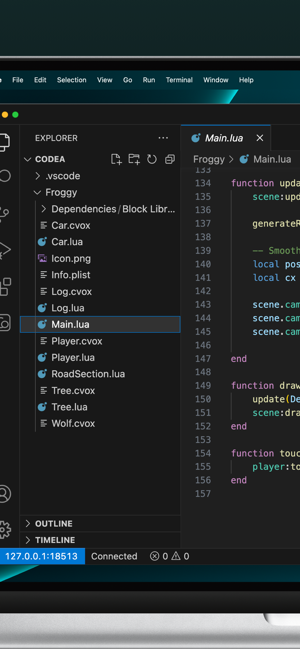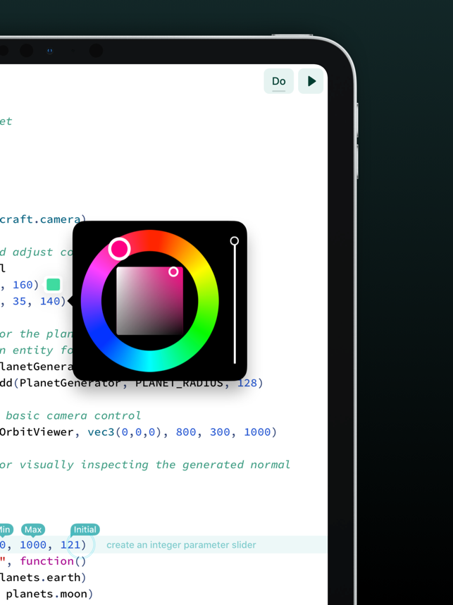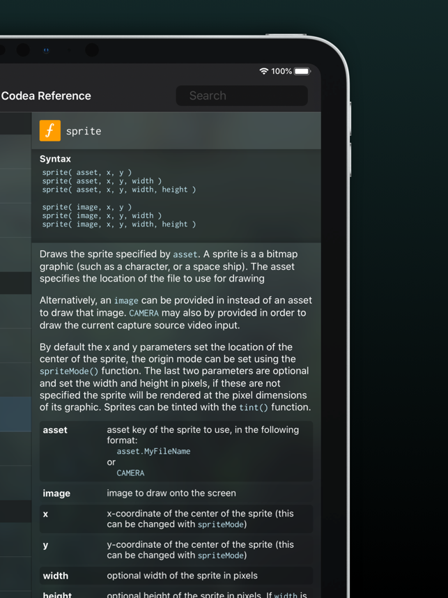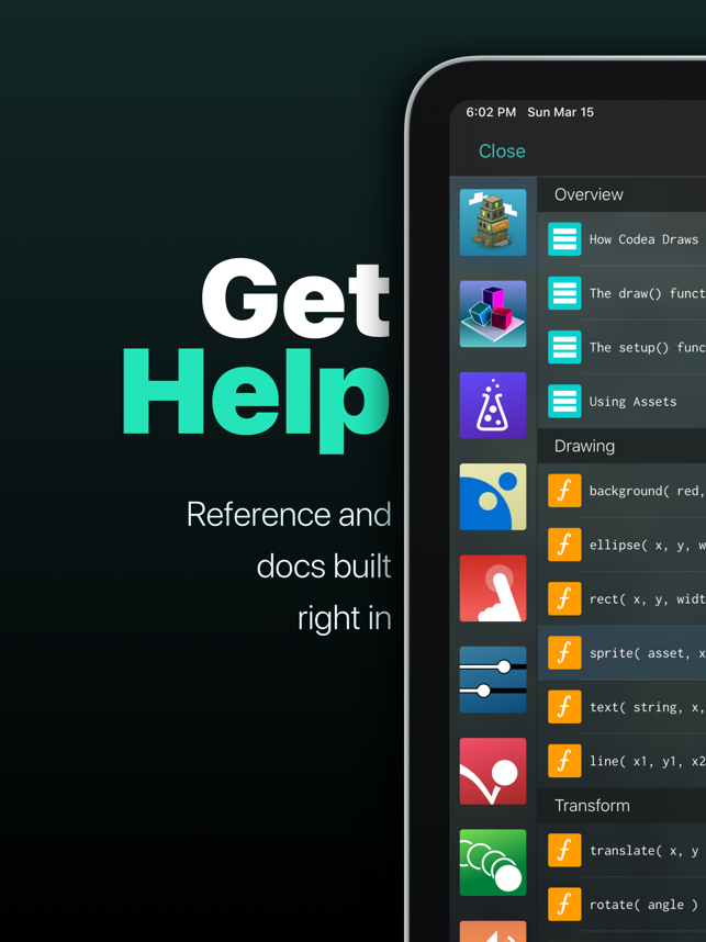 멀티터치나 속도계같은 기능을 사용하여 여러분의 생각을 상호 작용하는 작품으로 만드세요. 우리는 Codea가 가장 아름답고 쉬운 코드 편집기라고 생각합니다. Codea는 여러분이 작성한 코드를 터치로 수정 할 수 있게 개발되었습니다. 컬러나 이미지를 바꾸고 싶으신가요? 탭을하여 여러분이 원하는 것을 정확하게 선택할 수 있는 비주얼 편집기를 제공합니다. Codea는 Lua 프로그래밍 언어를 내장하였습니다. 기호에 너무 많이 의존하지 않는 간단하고 우아한 언어 - 아이패드와 완벽한 한 쌍을 이룹니다.여기에 사용법이 있습니다: 코드를 입력하세요. 실행버튼을 눌러 코드를 실행하세요. 창의력을 발휘하여 프로그램을 개발하세요.- 다양한 2D와 3D 그래픽을 제공합니다.- 다양한 게임들과 시뮬레이션 예제에서 수많은 것 들을 배울 수 있습니다.- 여러분의 창조물에 사용할 다양한 고전게임 효과음을 만들어보세요.- 코드를 터치 하세요. 컬러, 이미지, 사운드를 선택 할수있습니다.- 코드 작성 중 사용 설명서를 키보드에서 완벽하게 사용하실 수 있습니다.- 똑똑한 자동완성 키워드 및 함수 추천기능- 드롭박스에서 여러분의 자료를 가져올 수 있습니다.- 복잡한 동작에 대한 모든 기능을 갖춘 물리 엔진을 지원합니다.- 런타임에 변수를 조정할 수 있도록 시뮬레이션이나 게임 인터페이스에 매개 변수를 추가 합니다.- 여러분의 기기에서 가속도계 및 멀티터치와 상호작용합니다.- 비디오 녹화: 여러분의 프로젝트를 동영상으로 녹화하여 다른 사람들과 공유하세요! - 여러분의 코드를 Xcode로 변화이 가능합니다.- Codea는 3D 그래픽 렌더링이 가능합니다. - 내장된 쉐이더 편집기와 GLSL 쉐이더 언어를 지원합니다.- 사용자 지정 단축키를 포함한 블루투스 키보드를 지원합니다.- Air Code: 와이파이를 사용하여 코드를 컴퓨터에서 작성할 수 있습니다.도움이 필요 하거나 우리에게 연락을 하고자 하는 경우 이 페이지에서 지원 링크를 사용 하십시오.