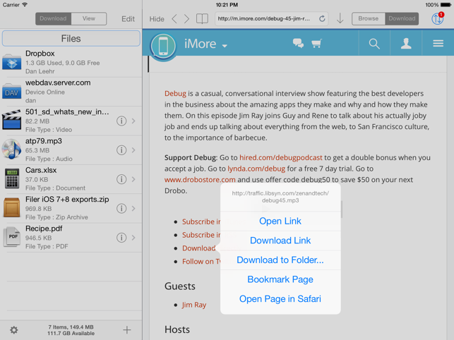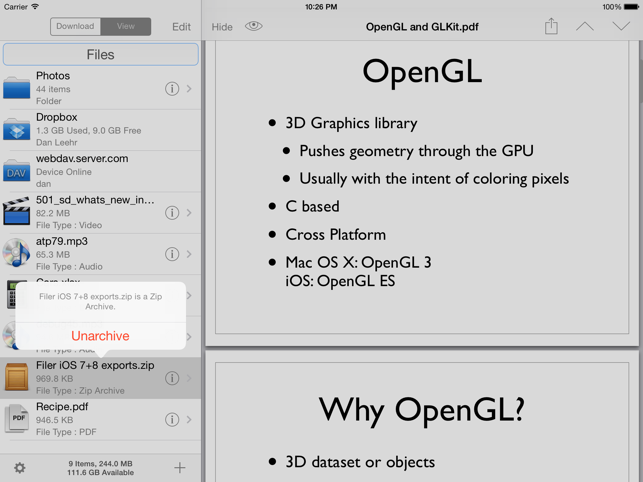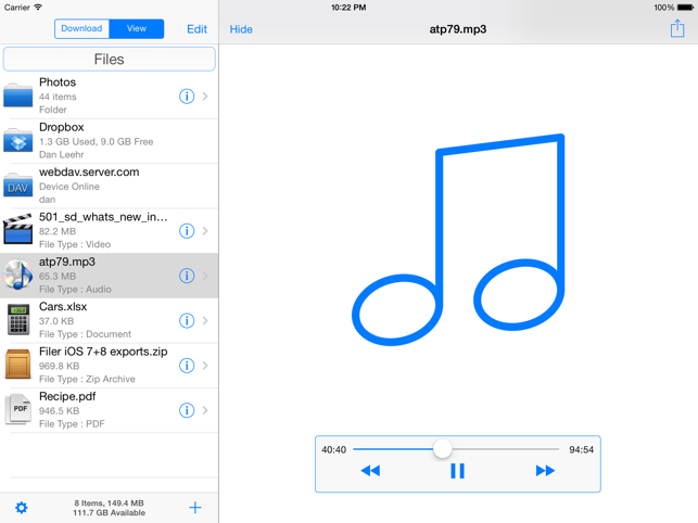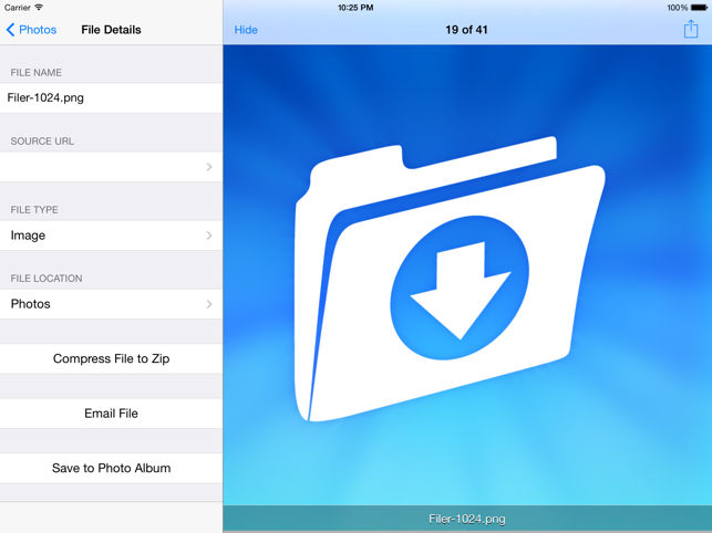 64-bit, optimized for all the latest devicesDesigned for iPad, iPhone, and iPod Touch.Dropbox and WebDAV, Background Downloads, and More"The very best app to help you download your files is called Filer." - appadvice.com-------- Overview --------Get your files anywhere!Filer is a unique application for iOS devices that lets you manage, view, and share your files. You can get your files on the go when you do have a network connection, and view them when you don't.-------- Features --------File Manager:* Clean UI with full featured File/Folder browser* Save files from other iOS apps - Use Filer to extract ZIP/RAR/TAR/Gzip Archives from any app that makes them available* Open files into other apps like iBooks, Pages, Numbers, Keynote.* Full-screen Quick-Look * Document Viewer features Page controls and quick slider* Enhanced media playback* iTunes USB File Sharing: Quickly drag and drop files between your device and Mac/PC* Save Photos to Device Photo Album* Move/Delete Mult