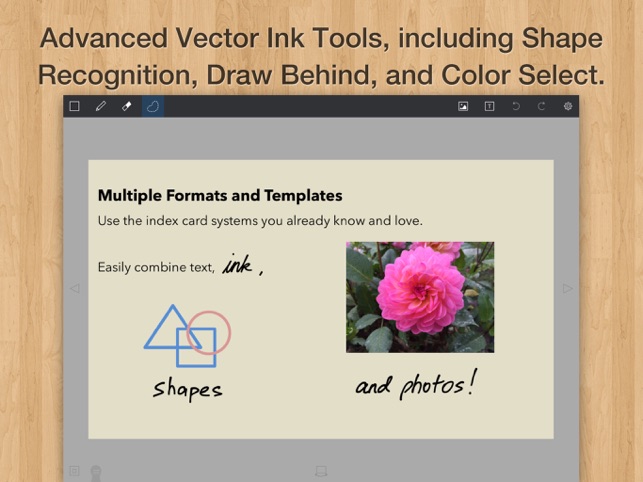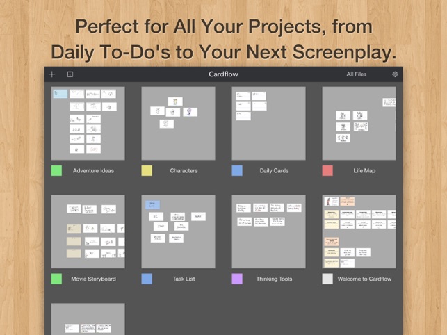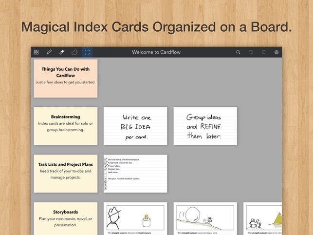 We love index cards. We use them a lot. They are a versatile and surprisingly powerful tool for all kinds of tasks. From brainstorming to storyboards, to planning entire projects, they have a place in your workflow.Cardflow captures the ease and flexibility of paper index cards and brings that experience to the iPad.Rather than impose a rigid structure up front, Cardflow allows you to lay things out however you like, and organize them in the way that makes sense to you.Jot down ideas or sketch diagrams on cards and arrange them on a large board. Write and draw using the buttery smooth Inkflow vector ink system, or type in a variety of fonts. You can even snap photos of actual cards to use as a background.Turbocharge your workflow today! Whether you are drafting story boards for a movie, laying out the plot and characters for your novel, or learning a new language, Cardflow has a place in your toolbox. Have all the fun of using index cards, without the forest-pulping guilt of paper.EDUC