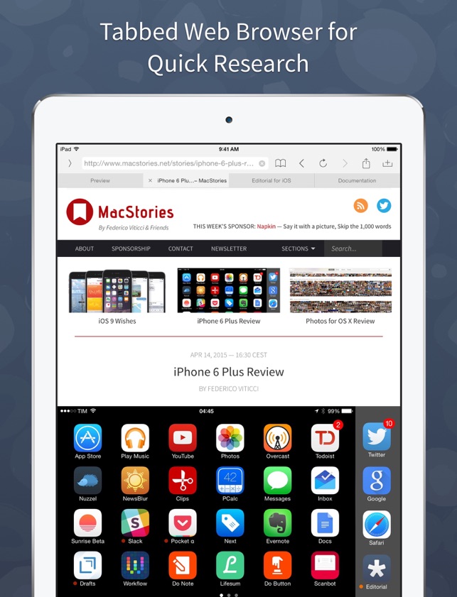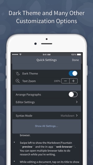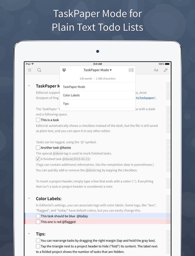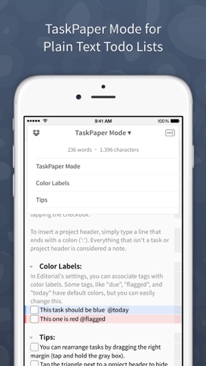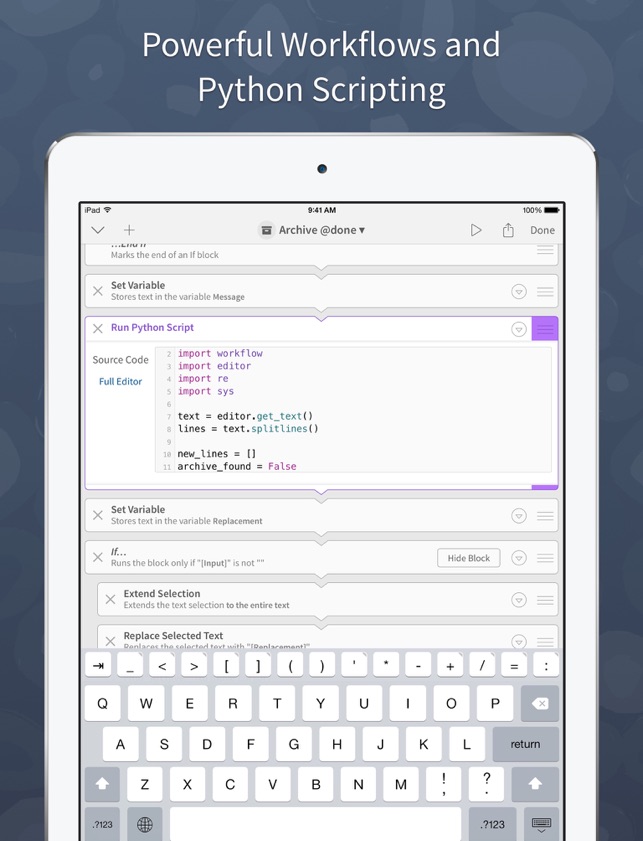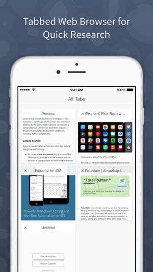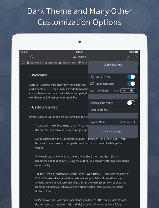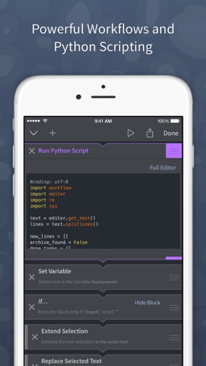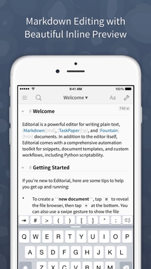 Editorial is a plain text editor for iOS with powerful automation tools and a beautiful inline preview for Markdown, TaskPaper, and Fountain documents.Features:* Inline Markdown/Fountain Preview – With Editorial's subtle syntax highlighting, you can see your document's formatting immediately while you're writing. And when you need a full HTML preview, it's just a swipe away.* Extensible with Workflows and Scripts – Select from over 50 text processing actions to create your own workflows for extending Editorial's feature set. For even more advanced automation, you can write Python scripts with an integrated code and UI editor.* Dropbox Sync – The sync folder is customizable, so you can easily edit your documents with multiple apps.* Smart Keyboard – The extended keyboard was specifically designed for writing Markdown and includes all the special characters you need. You can also control the cursor with simple swipe gestures.* Snippets – Quickly insert frequently-used