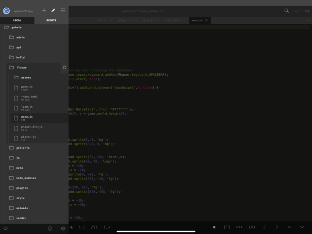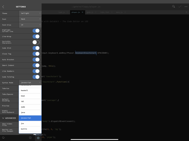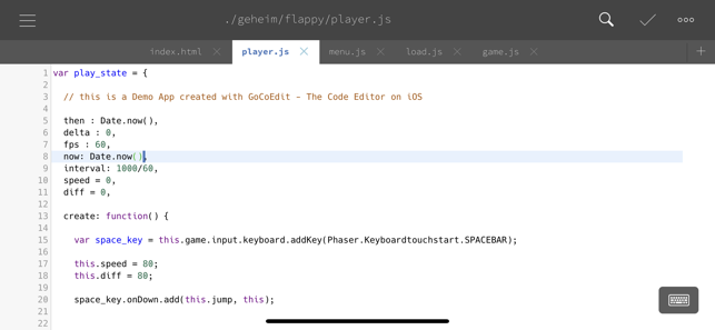 GoCodeEditor is a Code Editor optimized for fast opening and editing local and remote files (Dropbox, OneDrive, FTP, SFTP/SSH) on your iOS Device. FEATURES: ------------------------------• Sublime like Code-Editor!• Universal App (use it on your iPad, iPhone & iPod Touch)• iPhone X (s/s Max) support• Full iPad Pro support (including smart keyboard support, shortcuts, split-screen multitasking)• iPadOS Mouse & Trackpad• NEW! Multi-caret Editing• NEW! Siri Shortcuts - create newfile / start shell / connect to shell / preview - more soon...• Drag & Drop Support - Support for Drag & Drop files from the Files App - Support for Drag & Drop files / repos and folders from Working Copy App - Support for Dragging local files from GoCoEdit to other Apps• Compatible with Apple Watch Start a ssh-shell from your wrist right now! Run your self defined scripts with one tap.• Extra keybar with swipe functions and trackball to precisely move the cursor and select text• Syntax