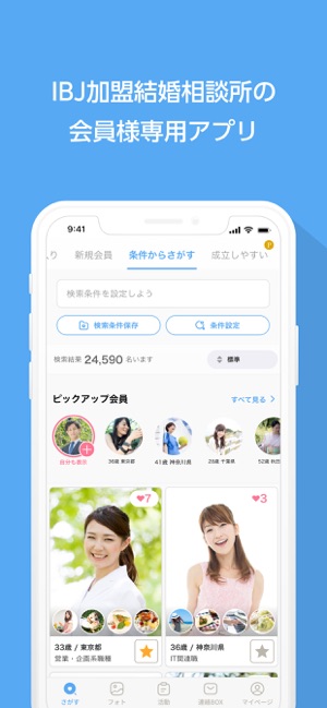 IBJ加盟の結婚相談所にご入会されている、会員様専用のシステムアプリです。(ご利用については、所属相談所からアカウントを発行されている方に限ります)お相手探し、お見合い申込み、その後の交際管理など、入会から成婚まで会員様のご活動をフルサポート。担当カウンセラーと行う、面談やお見合いの調整・相談・報告もよりスムーズに行うことができます。【対応OSバージョン】iOS14以上【注意事項】・本アプリの利用は、IBJに加盟する結婚相談所の会員であり、IBJS利用の為のアカウントが発行されている方に限ります。・利用規約と個人情報保護方針に同意の上ご利用ください。・本アプリ内コンテンツ「IBJSプレミアムパック」は有料となります。・有料プラン購入後のお支払いはiTunesアカウントへの請求となり、各申込プランに定めた期間毎の自動継続課金となります。・有料プランには以下の特典があります。 - 「成立しやすいお相手一覧」でお見合いが成立する可能性が高いお相手が閲覧できます。 - 「システムからの紹介」で職業や出身地、同年代のお相手が閲覧できます。 - 検索したお相手を「ログイン順」でソートして閲覧できます。 - 「みんなのフォト」に投稿したお相手が閲覧できます。 - 投稿したフォトにいいね!をくれたお相手が閲覧できます。 - 「共感キーワード検索」で趣味など共通点のあるお相手が閲覧できます。・自動継続課金は期間の期限が切れる24時間以内に自動で行われます。・購読期間終了の24時間前であれば、解約(自動継続課金の停止)ができます。・自動継続課金はユーザー様自身で管理することができます。購入後に「設定」>自身の名前をタップ>「サブスクリプション」から解約したいコンテンツを選び、自動継続をオフにすることが可能です。【料金】1ヶ月プラン 3,500円(税込)3ヶ月プラン 4,800円(税込)6ヶ月プラン 6,300円(税込)【利用規約】https://www.ibjapan.com/mem/static/kiyaku/【個人情報保護方針】http://www.ibjapan.jp/individual_renmei_lounge.html【アプリケーション・プライバシーポリシー】https://www.ibjapan.jp/app_privacy_policy【運営会社】株式会社IBJ