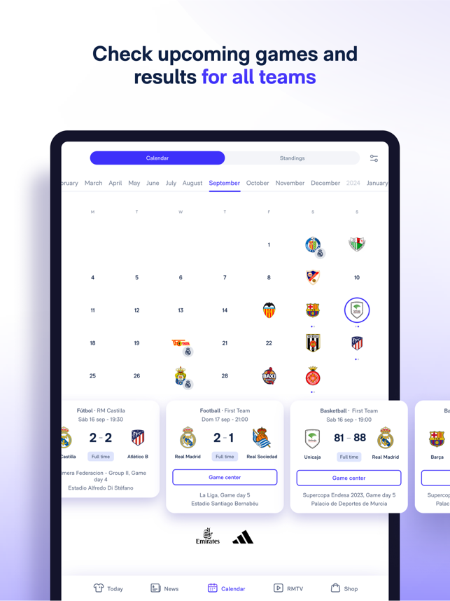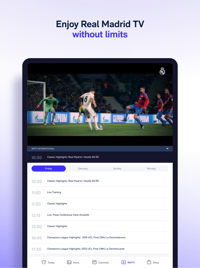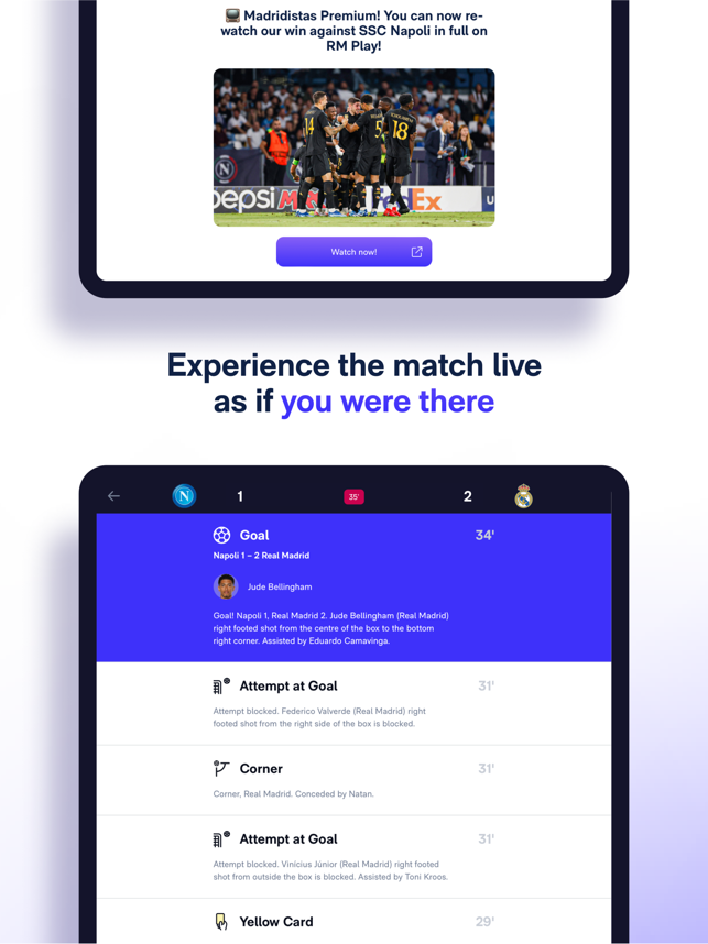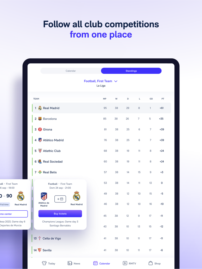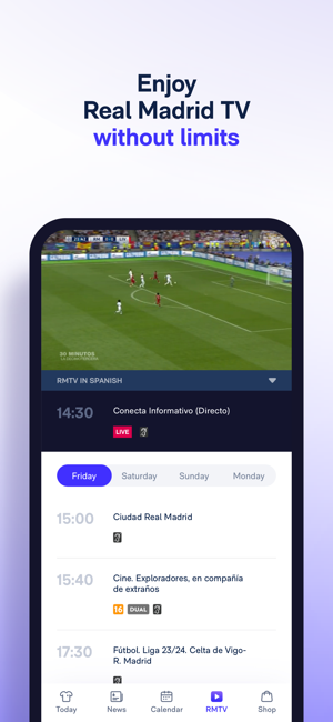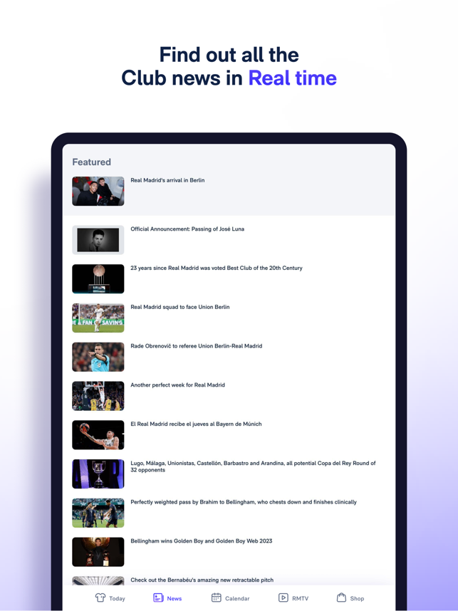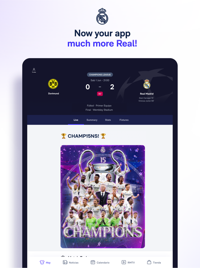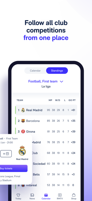 New Real Madrid App, the place where you can find all the football and basketball information with match pre-match coverage, live scores, post-match coverage, standings, exclusive news, and much more!Hello, Madridrista! This is the new and improved Real Madrid App, your window into exclusive news from the football and basketball world.What does the Real Madrid App have to offer?1. The pre-match coverage: find out the squads and line-ups before anyone else.2. Follow the game live: our live coverage combined with real-time statistics, commentary from our team, and exclusive views of the pitch.3. Post-match: relive the best moments with videos, reports and quotes from players and coaching staff.4. News: everything about the club and the players, from Bellingham, Modric, Vinicius, etc.5. Fixtures and league tables: men's and women's football and basketball. Follow any competition: LaLiga, Champions League, Copa del Rey...6. Real Madrid TV on your mobile: all the programming for the