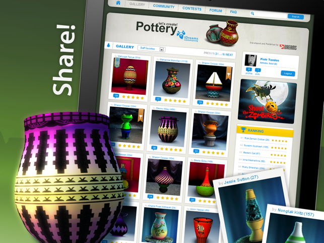 물레를 이용하여 점토의 형태를 만들고 모든 예술적인 재능을 발휘하여 이용 가능한 수십 가지 재료들로 자신만의 디자인을 만들 수 있습니다! 도자기는 여러분의 일상의 스트레스를 줄이고 마음의 평화를 찾을 수 있는 가장 좋은 방법이므로 최초로 도자기에 유약을 발라 가마에 구울 때에도 성취감과 편안한 기분을 느끼게 됩니다. 긴장을 푸는데 도움이 되며 행복감을 주는 놀라운 경험을 가족과 친구와 함께 즐길 수 있습니다!gameplay tutorial video: http://www.youtube.com/watch?v=4Myr4kw8QMM trailer video: http://www.youtube.com/watch?v=KxMb5f085lw
