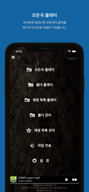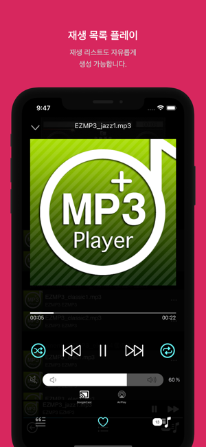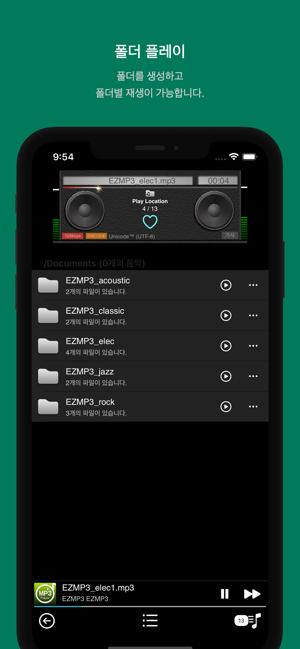 EZMP3 Player는 아이폰에서 손쉽게 음악을 감상할 수 있는 음악 플레이어 입니다.폴더 단위로 음악파일을 재생하며 관리하는 기능을 제공하며 앱내 모든곡 재생 및 셔플 기능도 사용 가능합니다.와이파이 로컬 통신을 사용하여 빠르고 간편하게 음악 파일을 아이폰으로 전송 할수 있습니다.에어플레이어 뿐만 아니라 크롬 캐스트 (구글 캐스트)도 지원을 하여 네트워크 오디오 기기에 캐스팅 또한 간단하게 사용하실 수 있습니다.하트 기능을 이용하여 좋아하는 곡을 바로 북마크 하실 수 있습니다.◼EZMP3 Player Pro의 주요기능 - 모든곡 셔플 기능- 플레이 가능한 파일 포멧 : mp3, m4a, flac, wav- 오디오 캐스트 Chromecast (GoogleCast)- 슬립 타이머 기능 (지정된 시간후에 음악 재생 종료)- 하트기능 (즐겨찾기 기능)- UI터치시 바이브레이션 기능- BitRate표시 기능- 셔플/한곡반복 기능- New마크 기능- 잠금화면 표시지원- 가사표시지원- id3 테그의 모든 인코딩 지원 - 아이튠즈 동기화 불필요 - Wi-Fi파일전송, 동시에 여러 파일 전송가능 - 백그라운드 음악 재생- 이어폰 (헤드폰) 버튼 조작시 비프음 효과 - 파일 및 폴더 직접관리 - 재생리스트 작성 - id3 테그지원 - 연주시 음압 그래프 시각 효과 구현 - 앨범/가수 갤러리보기 기능문의메일 : ytechmobile@gmail.com