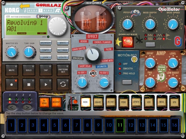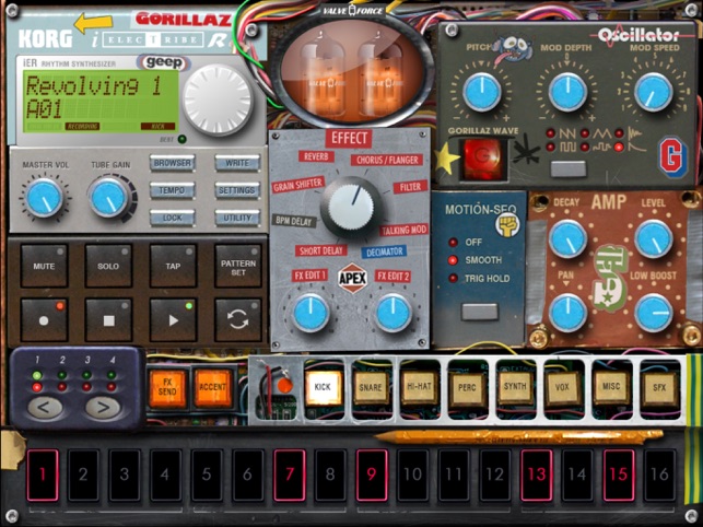 Korg has teamed up with the hugely popular and globally successful virtual band Gorillaz™ to create a new dedicated beatbox for the iPad: The iELECTRIBE Gorillaz Edition.The iELECTRIBE is a virtual analog beatbox for the iPad; sound creation is easy, fun and intuitive – just as on a vintage analog synthesizer. Simply choose a part and touch the 16-step sequencer to quickly build a groove. The aggressive sound, unique functionality, and intuitive beat-building style of the iELECTRIBE made it a favorite of Gorillaz for their latest album “The Fall”.While retaining the intuitive beat-making features of the iELECTRIBE, the special Gorillaz Edition is a new machine customized to generate Gorillaz samples from their fourth album “The Fall” which allow the user to create music in a wide variety of musical styles. The iELECTRIBE Gorillaz Edition features: a unique design and synthesizer engine including 128 new sounds created by Gorillaz; and 64 ready-to-use pre-programmed patterns by the soun