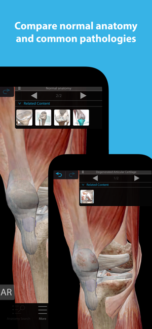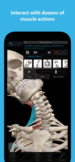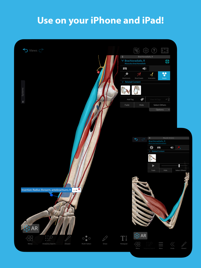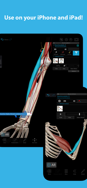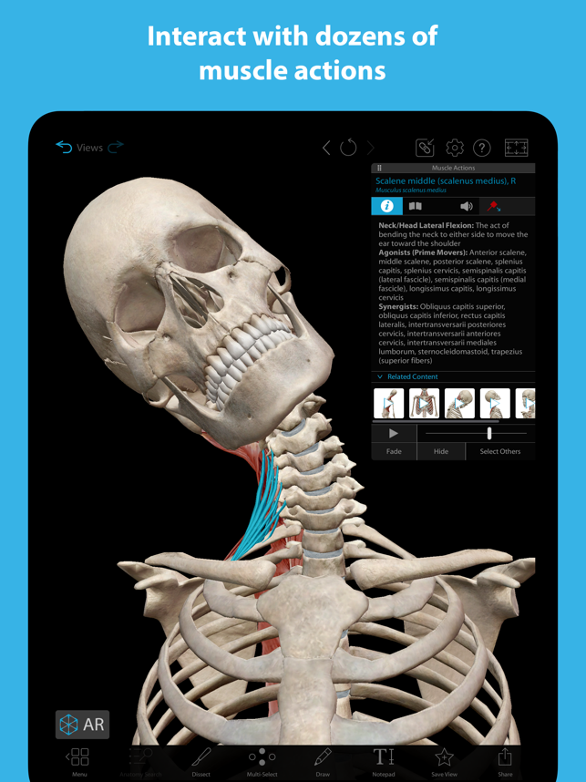 Muscles & Kinesiology is a detailed guide to understanding how muscles and bones interact and how common injuries and conditions occur. Explore thousands of 3D models to visualize and learn about musculoskeletal structure, function, movement, and pathologies in this handy pocket reference—perfect for on-the-go practitioners, athletes, yogis, and students. + Explore thousands of 3D models of muscles, bones, ligaments, bursae, nerves, and vasculature from any vantage point or zoom level.+ Compare normal anatomy and common pathologies with dazzling 3D models of sprains, cervical radiculopathy, a torn meniscus, carpal tunnel syndrome, bone spurs, and many more. + Manipulate dozens of muscle action animations, even in mid-motion, to understand the biomechanics of muscle movement.+ Access detailed information about any of the thousands of anatomical structures in the app, including in-depth definitions, interactive muscle attachments, bony landmarks, innervation, blood supply, and more.T