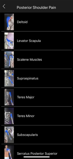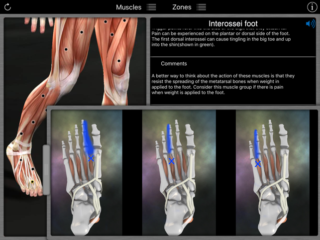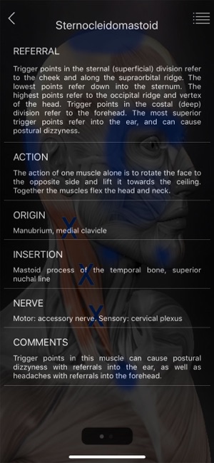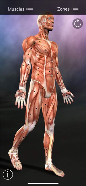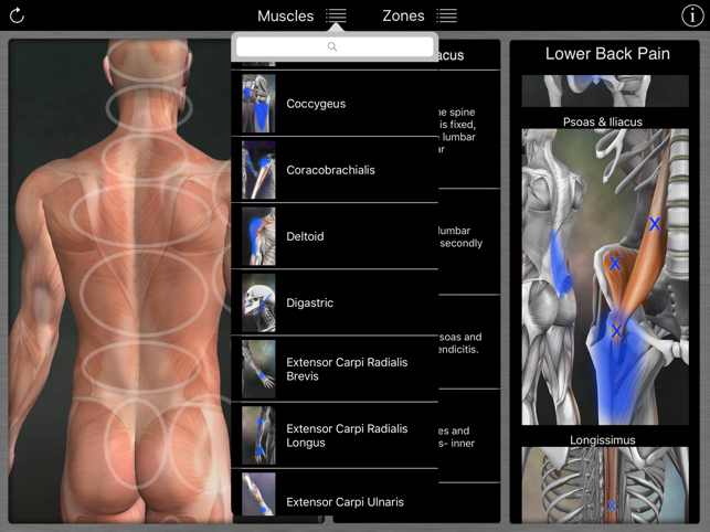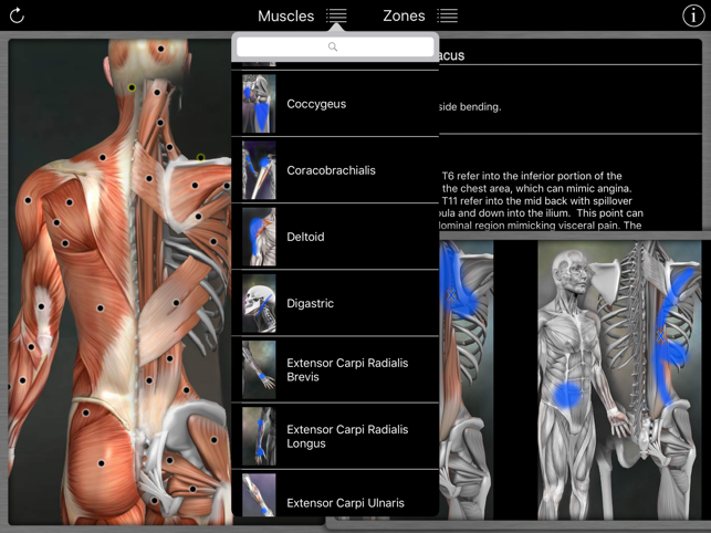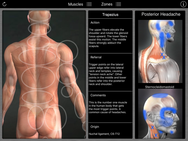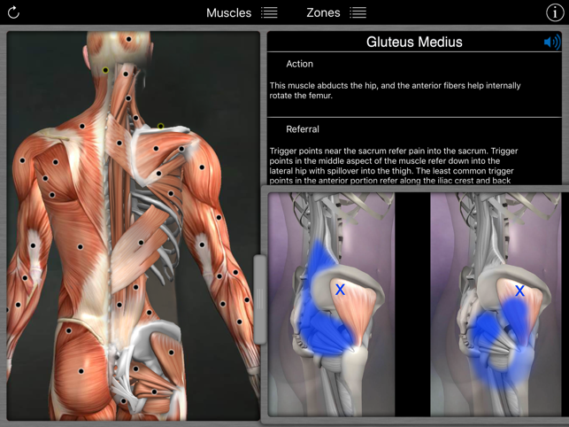 A reference for trigger points and referral patterns for 108 muscles. Features 160 trigger points with their corresponding referral patterns, 80 conditions that can be caused by trigger points, and 25 videos that show how to release specific muscles. Each muscle includes the visual referral pattern and point location, plus a written muscle action, referral, origin, insertion, nerve, comments, and audio pronunciation for each muscle. You can choose to view each muscle individually, or use the zones view to see all the muscles that refer into a specific area (or for a specific condition). This is a great help in discovering the source of pain. This app features all the scientifically proven trigger points and referral patterns as shown in the research. Trigger points are tight places in a muscle that cause pain to be felt elsewhere in the body. This is great for massage therapists, physical therapists, chiropractors, or anyone wanting to discover the source of muscular pain, and learn a
