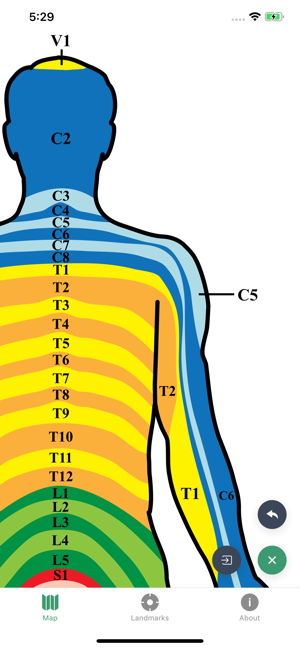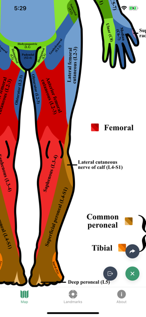 Dermatomes is a handy reference map of which spinal nerve roots relay sensation from particular areas of the skin along with a cutaneous nerve distribution.Dermatomes provides a zoomable map of anterior and posterior dermatomes and cutaneous nerve distributions with a reference chart of important landmarks . Pinch to zoom in and out on the map.Dermatomes is an essential reference for neurologists, emergency physicians, family doctors, medical students, physiotherapists, chiropractors, osteopaths and other medical professionals – or anyone curious about neuroanatomy and the workings of the human body.Featured in Apple's 2010 essential apps for medical students.Consult a doctor if you are experiencing neurological symptoms. This app should not be relied upon to make clinical decisions, which remain the full responsibility of the user. Dermatomes are variable between individuals and the pattern of sensory loss is usually less than the entire dermatome, because of overlap. The map and