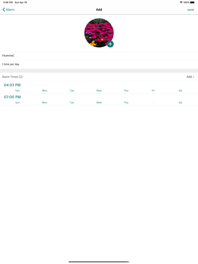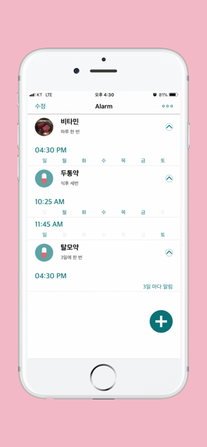 약 먹는 걸 자꾸 잊으시나요? 약의 효과를 높이기 위해서는 꼬박꼬박 복용하는 것이 가장 중요합니다.이 앱은 자신이 지정한 시간에 알림을 보내 약을 꼬박꼬박 먹을 수 있도록 도와주는 건강앱입니다.지금 바로 설치하셔서 내 건강은 물론 가족들의 건강까지 챙겨주세요.[주요 메뉴 및 기능]1. 복용약 추가하기 - 사진, 이름, 복용법, 알림시간, 알림일(월,화,수,목,금,토,일) 을 지정하여 원하는 시간에 알림을 받을 수 있습니다.또한, 요일 기반이 아닌 원하는 기간마다 알림을 받을 수 있습니다. 2. 복욕량 리스트 보기 - 자신이 먹고있는 약 종류와 해당약의 복용시간을 보기 쉽게 리스트로 보여줍니다. 3. 다국어 지원 - 영어 및 한국어를 지원합니다.