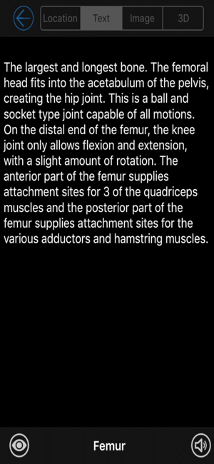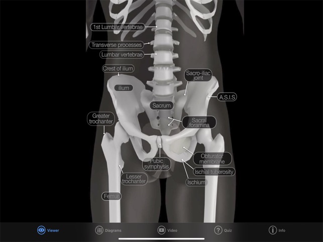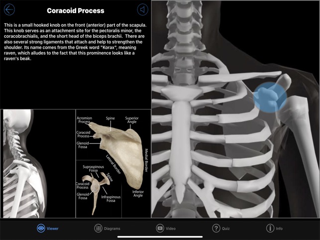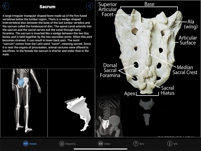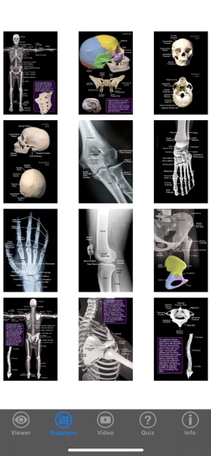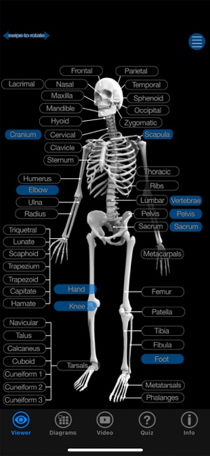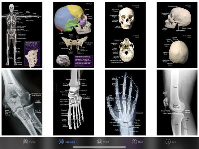 An amazing 3d exploration into the skeletal system. Test your knowledge of 140 bones and landmarks with our Speed Quiz in 3D (with audio), or expand your knowledge with the reference section, nine 3D models, 12 Diagrams, hundreds of images of real bones, plus video that discusses the skeletal system. SPEED QUIZ 3D: Featuring 140 bones and landmark locations, plus an audio option that speaks the correct pronunciation of each structure as the quiz progresses. The quiz is randomized, and you can choose from a half quiz (70 questions), the full quiz (140 questions), or practice mode where you practice 10 questions at a time on an area you need help with.REFERENCE MODE: Choose the structure that you want to see, then view written comments, listen to the correct pronunciation, view diagrams of the structure, and see it rotating in 3D that you control, plus images of the real bone! DIAGRAMS: 12 pages covering the entire body. Each diagram is high resolution and can be zoomed in for detail. 3D