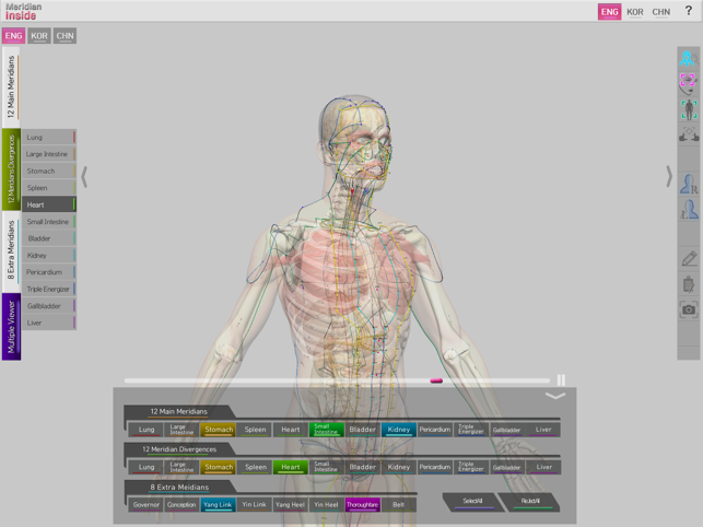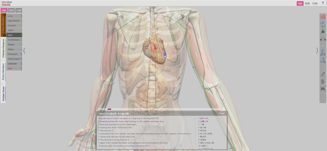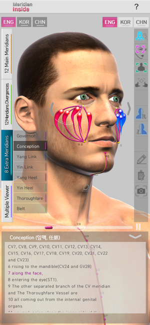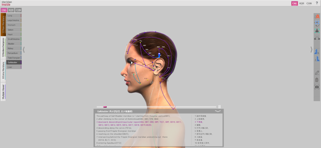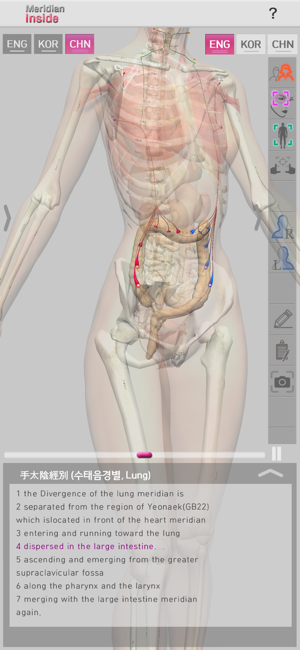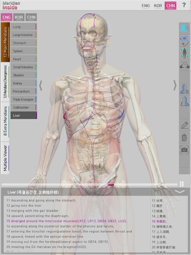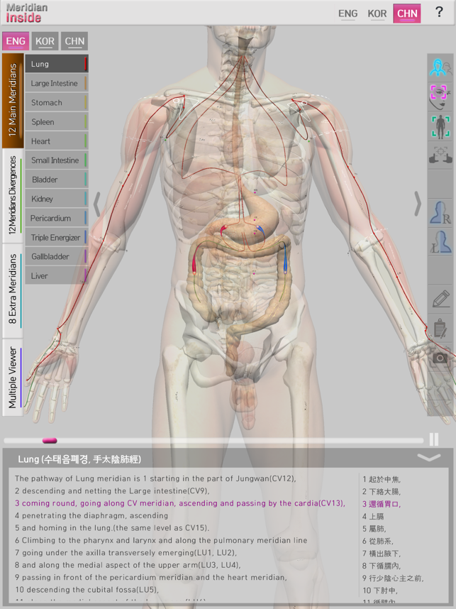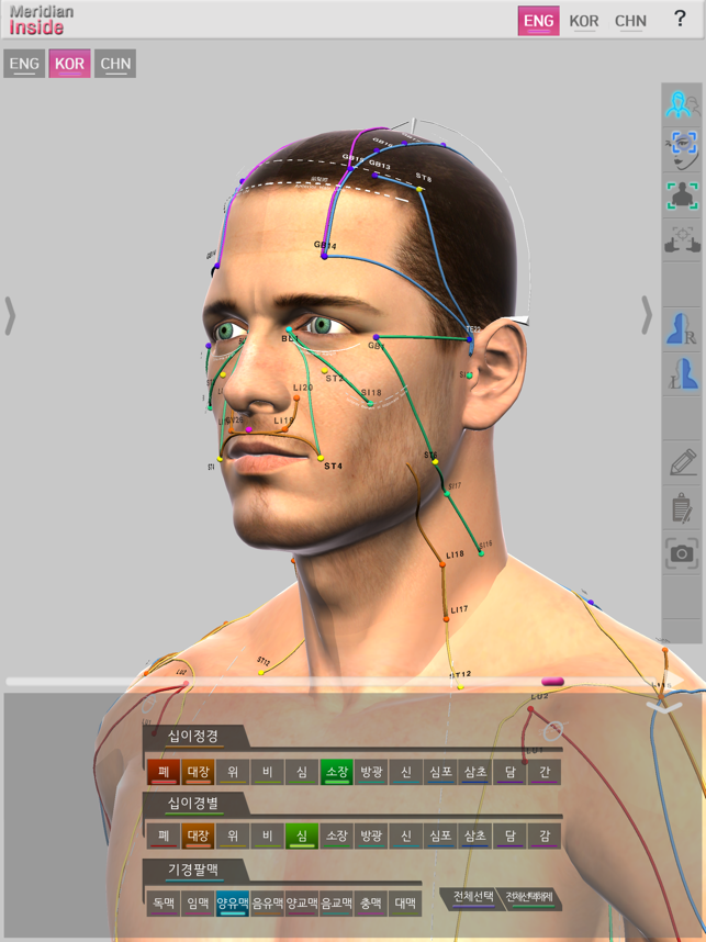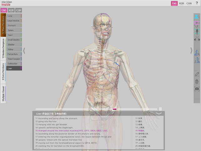 ‘Meridian Inside' 앱은 ‘12정경’, ‘기경팔맥’, ‘12경별’을 통합하여 ‘정경혈’과 함께 3D 인체모델에 적용하여 만들었습니다. 하나 밖에 없는, 한의학의 경락흐름을 확인할 수 있는 어플리케이션입니다.총 32개의 경락의 위치와 흐름, 컨텐츠를 확인 할 수 있습니다. 각 경락의 내용은 황제내경 영추 원문이 수록되어 있습니다.멀티터치의 확대, 축소 기능과 주행버튼의 추가로 경락의 정확한 위치를 알 수 있습니다. ‘12정경’, ‘기경팔맥’, ‘12경별’을 동시에 파악 할 수 있으며, ‘정경혈’과 같이 비교 할 수 있습니다. 한글, 영어, 한문 3종류의 언어로 제작하여 다국적으로 이용 가능합니다. 3D 인체 모델의 피부, 뼈, 근육, 내부 장기를 실제에 가깝게 구현하였고, 혈자리와 각경락이 다양한 컬러로 구분되어 있어서 사용하기 편리합니다* 정경혈 -> 12 경락의 정경혈 , 임맥, 독맥. - Acupoints 앱을 참고하세요.* 정경혈(임맥, 독맥, 폐, 대장 등등 혈자리)은 Acupoints 앱을, 경락(12정경, 14정경, 기경팔맥, 경피, 경근, 12피부등등)은 Meridian Inside 앱을, 경외기혈은 Extra Acupoints 앱을 참고하세요. 동씨혈(동씨, 마스터 동씨)는 Master Tung Acupoint 앱을 참고하세요. *이 제품엔 경혈과 경외기혈, 동씨혈에 대한 완전한 텍스트 설명이 없습니다.* 이 제품에는 12경근, 12경피, 12피부는 없습니다.한의학(동양의학, 중의학)을 선도하는 베르데루트(오토마루, 아큐몬스터, 메디몬스터)의 다양한 제품(메리디안, 인사이드, 동씨, 경외기혈, 기외경혈, 조합혈, 수침, 족침, 두침 등)을 만나보세요.본 제품은 ‘WHO/WPRO 표준 경혈 위치’, ‘대학경락경혈학’, ‘황제내경 영추’를 기본으로 하고, 그 외 다양한 서적을 참고하였습니다. 한국 한의과대학 교수님과 한의사들의 감수를 받았습니다.한의학, 동양의학, 중의학, 침술, 지압, 트리거 포인트 및 반사 요법 또는