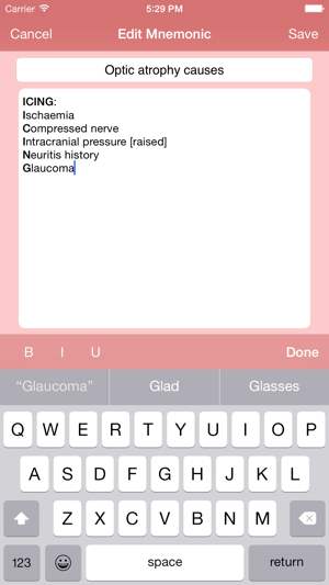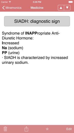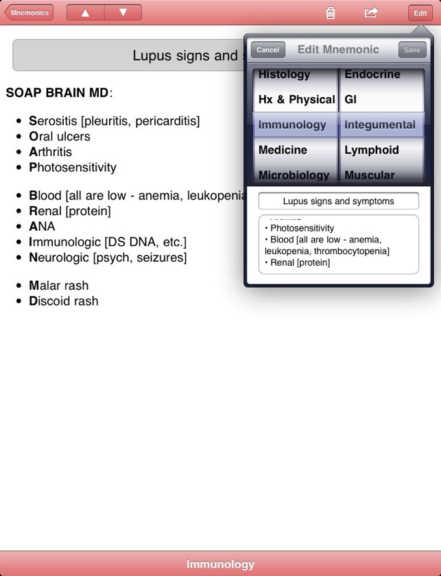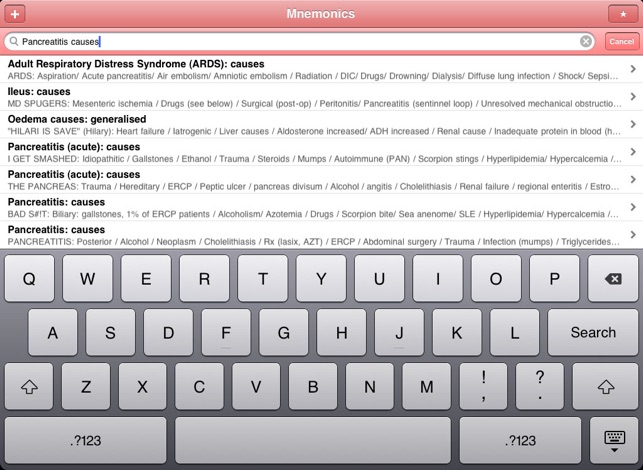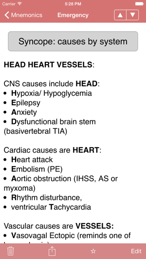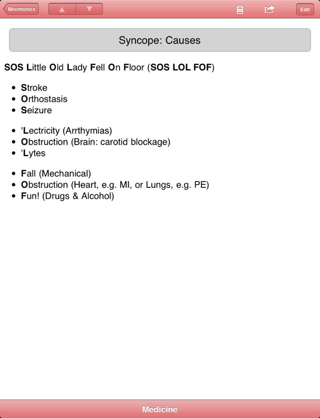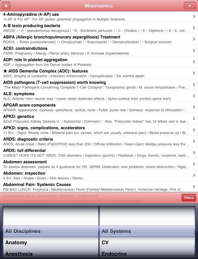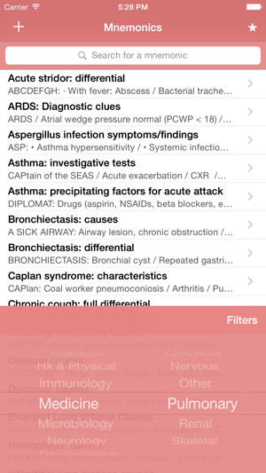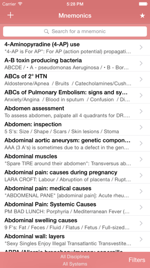 mnemonic, noun: a short rhyme, phrase, or other mental technique for making information easier to memorize [from Greek mnēmonikos, "relating to memory"]. Med Mnemonics is a unique learning tool with over 1900 of them.Mnemonics got me through medical school and the USLME steps. Wherever you are within the allied health professions - medical school, nursing school, NP school, PA school, residency, and beyond - you can improve your knowledge base in the short and long term with these key associative memory aids.Medical Mnemonics puts 1796 clever acronyms, rhymes, and memory tricks on your iPhone or iPod Touch, covering topics ranging from Anatomy and Biochemistry to Pharmacology and Surgery.The database is fully searchable and can be quickly filtered by discipline and by system. Create a Favorites list, and search and filter it similarly.The best mnemonics can be those you make yourself. Add your own mnemonics to the database, where they'll appear seamlessly alongside those