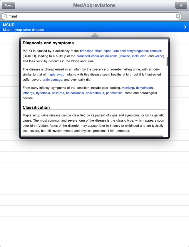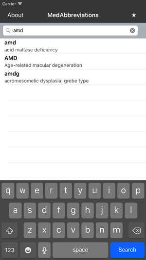 MedAbbreviations provides instant access to over *fourteen thousand* abbreviations. If you are a medical professional, or if you ever read what a healthcare professional writes, you need to be able to understand those cryptic shorthand scrawls. MedAbbreviations is your solution.Over 14,000 medical abbreviations: scrollable, searchable, and bookmarkable. Why pay more or get less?A tool like this is only as good as its consistency. MedAbbreviations is the right tool for the job; competing applications, with significantly smaller databases, have 1/10th the chance of providing you with the explanation you seek every time.Search by abbreviation via the instant search bar, or scroll with the alphabetical index on the right side. Find what you need, the way you want to find it.You can add abbreviations to your Favorites list by just double-tapping an entry; a star then appears by its name. Your Favorites list is yours to control, ordered how you want.Tapping an abbreviation shows a details
