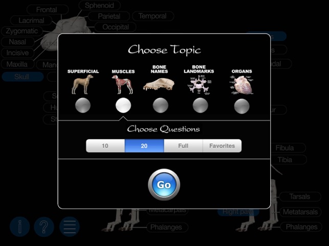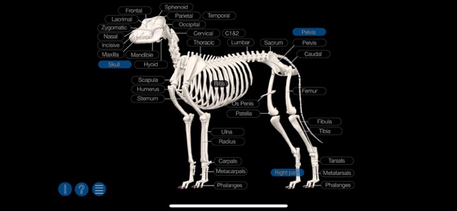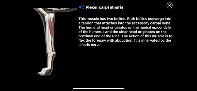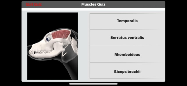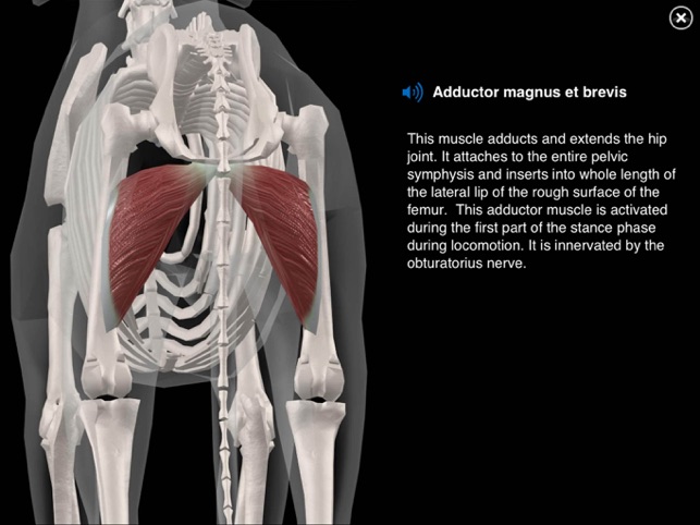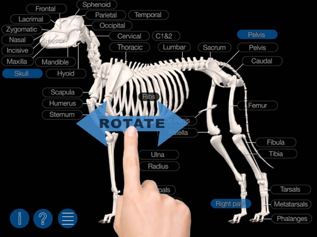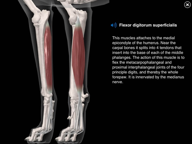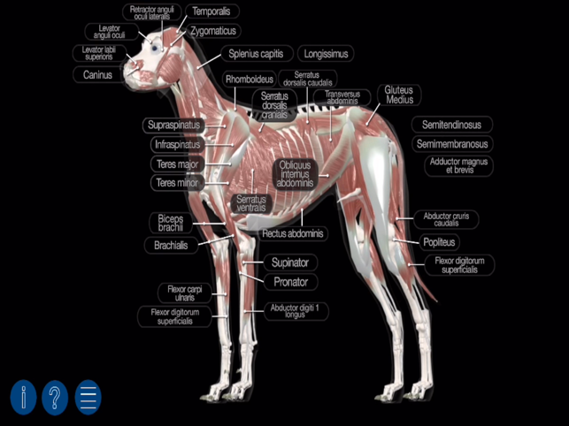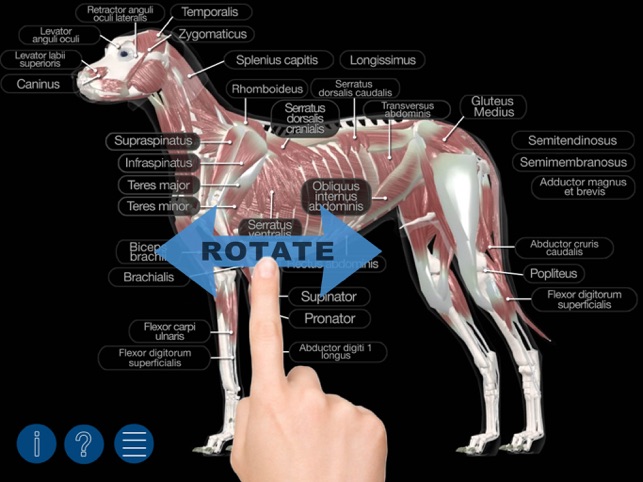 An interactive visual reference with over 300 anatomical structures. Rotate the model, cut down through layers, or zoom in. Tap the labels to get details of each structure with audio pronunciation, text descriptions and a close-up view. This app covers the superficial landmarks, superficial and deep muscles, bones, and organs. Quiz yourself on each section, make your own quiz, or have the app quiz you on just what you missed. If you want to understand canine anatomy, this app is for you.