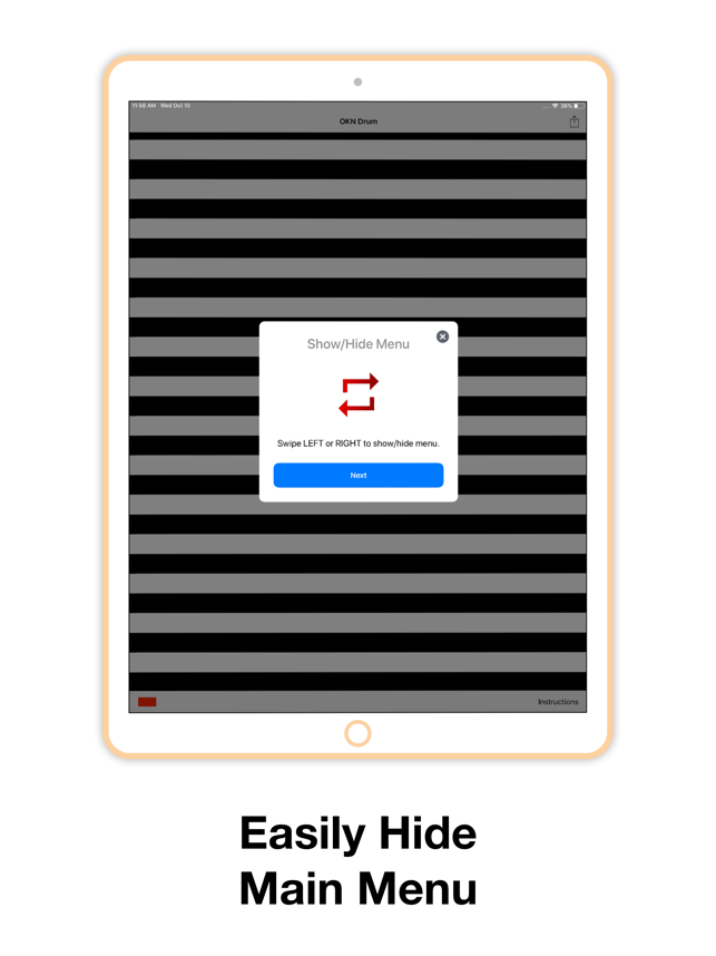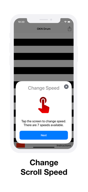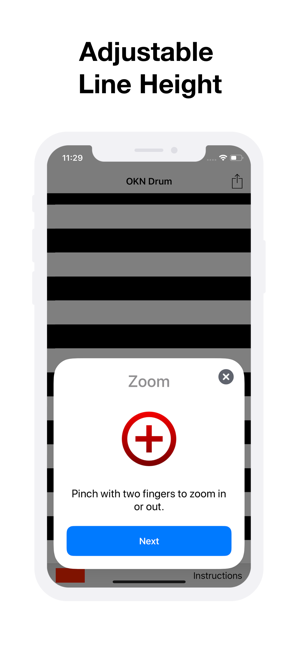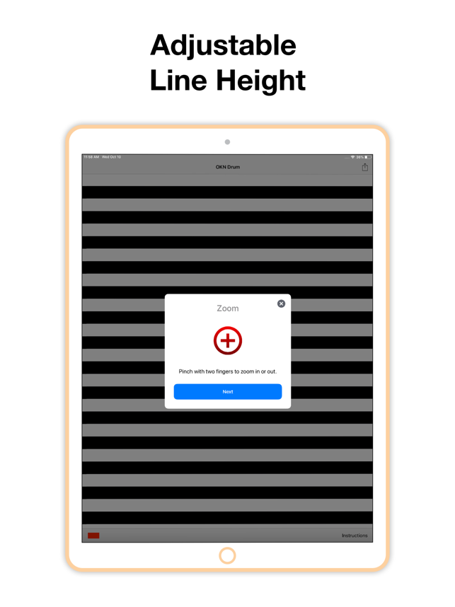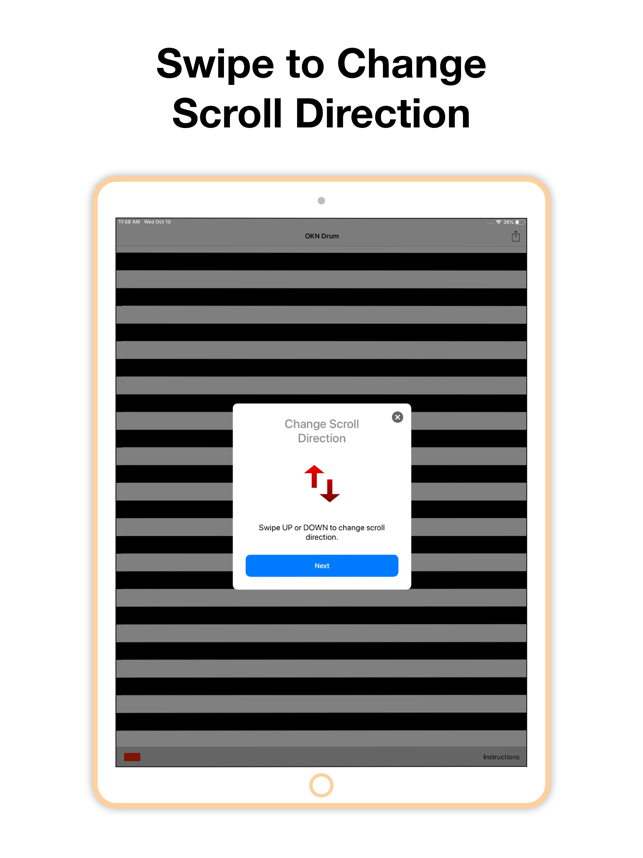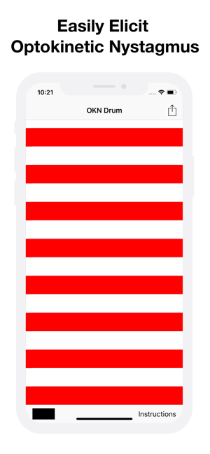 Replace your bulky optokinetic drum with OKNDrum.OKNDrum is the easy-to-use alternative to a physical optokinetic drum. Our app is used to evaluate neurological, otological, and ophthalmological disorders. To use OKNDrum simply place the iPhone or iPad in front of the eyes to elicit the response. The stripe color, width, speed, and direction can be adjusted easily. OKNDrum features:- 7 Scrolling Speeds- Red or Black Stripe Colors- Adjustable Scroll Direction- Adjustable Stripe Size- Easy-to-hide Menu- Easy-to-follow InstructionsFeel free to contact us with any questions or feedback.*** OKNDrum was developed with the help of medical professionals and with the help of research papers. *** OKNDrum IS NOT a substitute for medical support. Consult your doctor for any advice.
