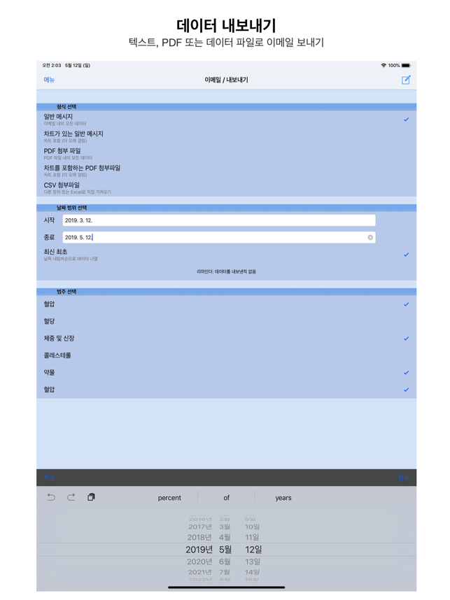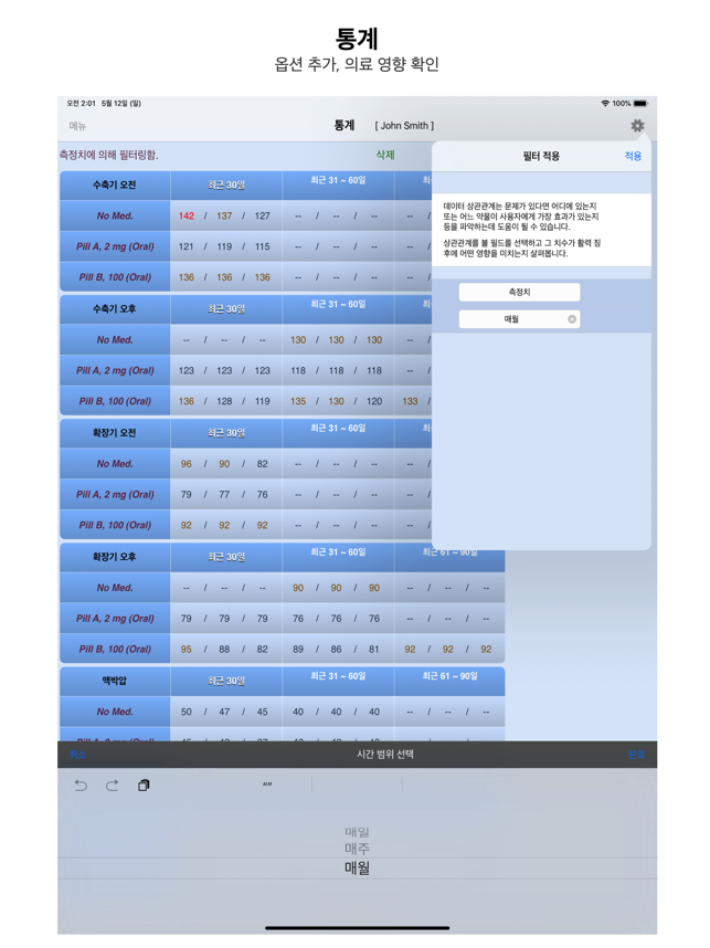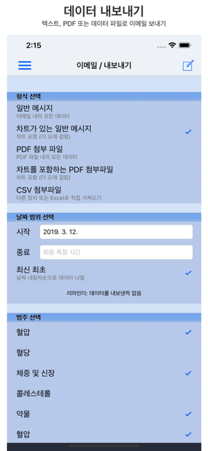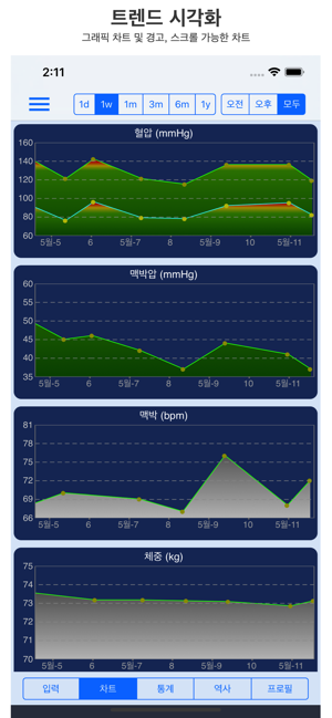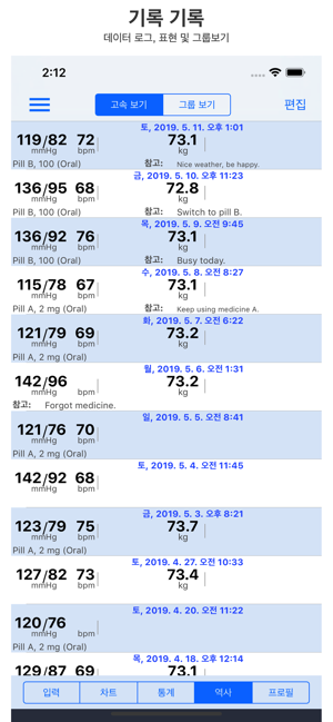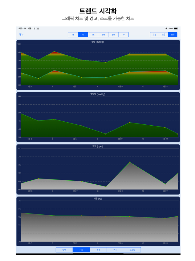 혈압 기록 - 프리미엄 앱을 사용하면 혈압, 체중, 체온 및 기타 건강 데이터를 쉽게 관리할 수 있습니다. 평생 데이터 추적, 차트 시각화, 통계 보고, 약물 상관 관계, 이메일 가져오기/내보내기, 선택적 클라우드 데이터 동기화, 미리 알림 등 다양한 유용한 기능이 함께 제공됩니다.우리 앱의 뛰어난 기능 중 하나는 포괄적인 데이터 추적 기능입니다. 이 앱을 사용하면 모든 건강 및 의학 판독값을 한 곳에서 관리할 수 있으므로 건강을 쉽게 관리하고 잠재적인 문제를 미리 파악할 수 있습니다. 건강한 체중을 유지하거나, 혈압을 조절하거나, 약물을 모니터링하려고 할 때 이 앱으로 해결할 수 있습니다.- 종합 읽기 입력 필드 모음- 사용자 정의 가능한 입력 데이터 양식- 간소화된 사용자 인터페이스- 키보드 입력 최적화약물 상관관계 - 복용하는 약물에 따라 활력 징후가 어떻게 변하는지 알고 싶었던 적이 있습니까? 서로 다른 두 팔에서 혈압이 어떻게 다른가요? 이 앱은 알아내는 데 도움이 되도록 설계되었습니다.- 경구 및 주사 유형 모두 약물 추적 및 상관 관계- 혈압 측정을 위한 좌/우 팔 트래킹 및 상관 관계- 혈압 측정을 위한 신체 위치 추적 및 상관관계- 포도당 측정을 위한 식사 유형 추적 및 상관 관계- 앞으로 더.데이터 시각화 – 차트는 천 단어의 가치가 있습니다. 그래픽 차트는 활력 징후의 시각적 추세를 제공할 뿐만 아니라 경고 징후도 보여줍니다(BP만 해당).- 모든 생체 신호가 그래픽으로 표시됩니다.- 시간 제한 없음- 더 많은 데이터 기록을 보려면 스와이프하여 차트를 스크롤하세요.- 최적화된 차트 그리기 성능데이터 동기화 - 서로 다른 iOS 장치 간에 원활하게 자동 데이터 동기화.- 한 번 입력하면 모든 기기에서 볼 수 있습니다(현재 iOS만 해당).- 당신을 위해 클라우드를 작동- 활성 계정이 필요합니다(무료 생성 가능).이메일 가져오기/내보내기 – 단순하지만 다양한 이메일/내보내기 기능을 사용하면 의료 서비스 제공자와 쉽게 통신할 수 있습니다.- 선택