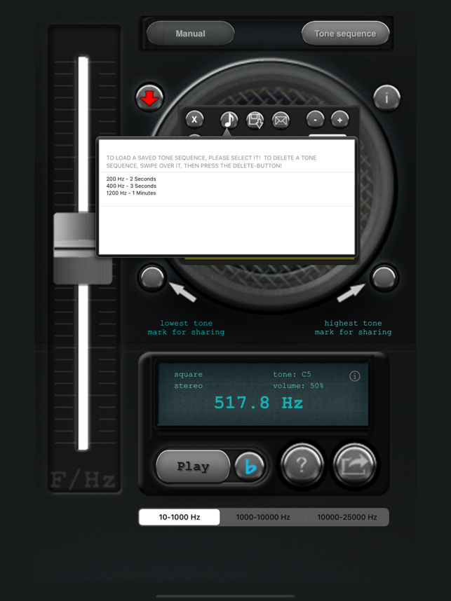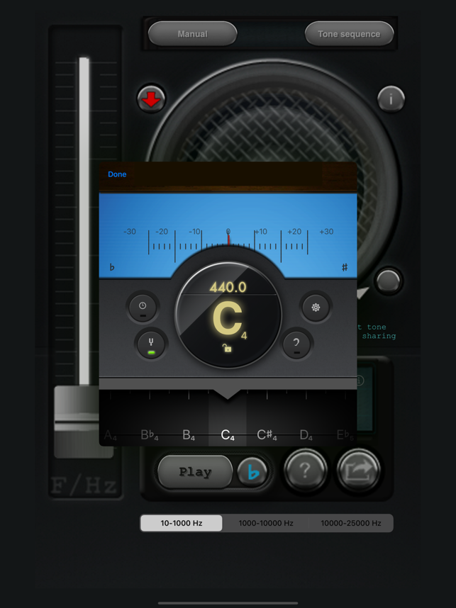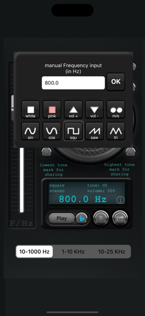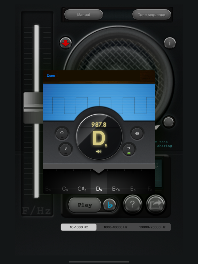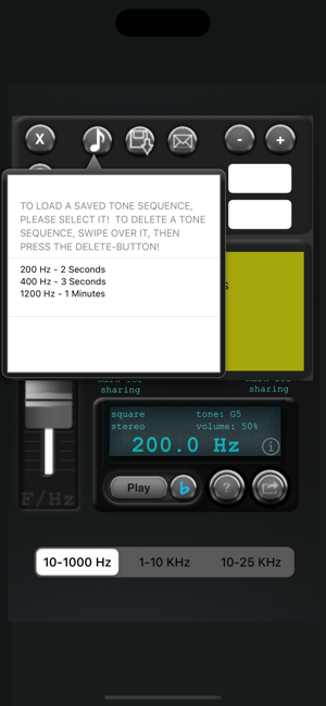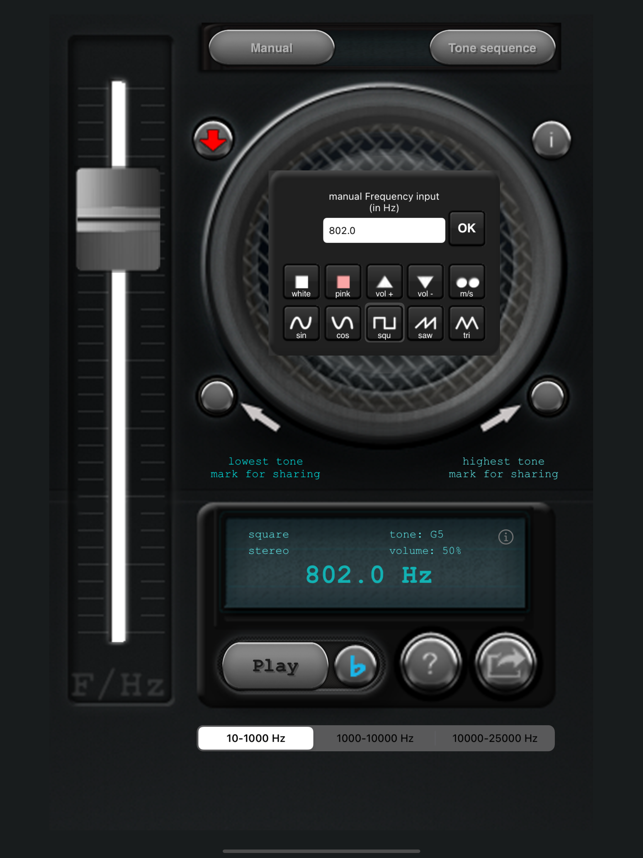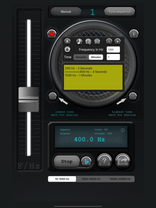 주파수와 진폭을 조정할 수 있는 다양한 파형의 주기적 신호를 생성합니다. 앰프 및 필터와 같은 전자 회로를 테스트하는 데 사용됩니다. 음악가가 악기를 튜닝하는 데에도 적합합니다. 음이 울리자마자 통합 튜너가 음정을 인식하고 음 이름과 편차를 표시합니다. 균일한 음색을 내는 모든 악기에 적합합니다. 메트로놈은 연습에도 도움이 됩니다.벌레를 쫓아내거나 친구 및 친척과 청력을 비교하고 결과를 공유하세요! 또는 다른 사람들이 당신을 찾을 수없는 소리를 찾기 위해 귀를 긴장시키는 것을 지켜보십시오. 파티의 즐거움이 보장됩니다!특별 기능: - 10Hz - 25kHz- 수동 주파수 입력- 연결된 블루투스 장치(예: 스피커)를 위한 앱 기능 지원- 다른 신호- 흰색 / 분홍색 노이즈- 튜닝 휘슬이있는 튜닝 악기 용 튜너 (실시간 톤 인식 C1-C8)- 꾸준한 템포를위한 메트로놈- 주파수에 대한 메모 / 톤- 왼쪽 / 오른쪽 채널, 스테레오- 특정 시간 슬롯에서 여러 다른 주파수를 재생하기위한 톤 시퀀스 생성- 톤 시퀀스 루프옵션 기능:- 톤 시퀀스 저장 및 삭제- 저장된 톤 시퀀스 불러오기- 톤 시퀀스를 오디오 파일(.caf 형식)로 보내기- 오디오 파일 압축 옵션주의: 다른 사람들과 결과를 공유하고 싶으면, 먼저 가청 주파수를 테스트한 다음 내 최저 가청 톤과 최고 가청 톤을 스피커 아래에 표시하세요. (임시로만 저장됨) 작은 힌트: 차트에는 내 나이대에 들을 수 있는 다른 주파수가 표시돼요.