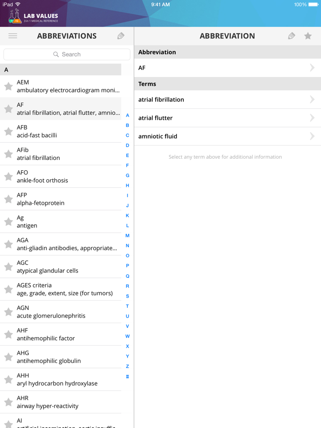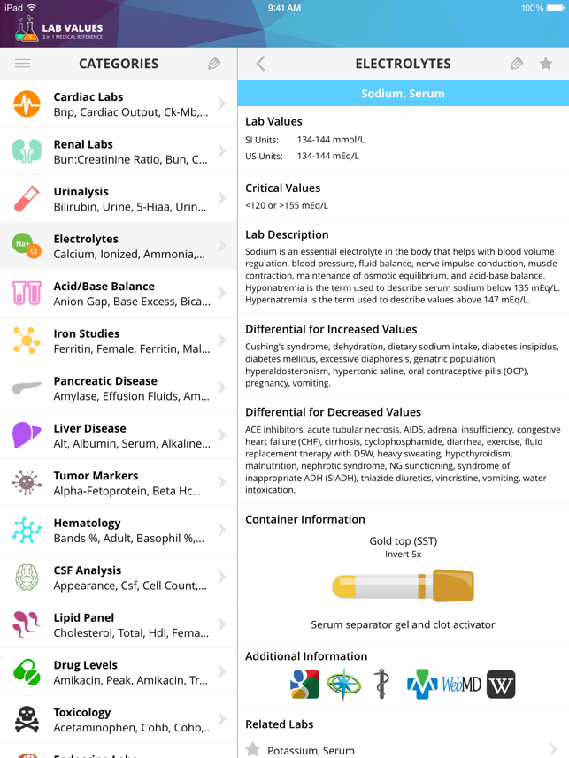 *TOP RATED LAB VALUE AND MEDICAL REFERENCE APP ON iTUNES*FEATURES:* 3 Medical reference apps in 1: Lab Reference Values, Medical Abbreviations and Medical Prefix / Suffixes.* Data is completely editable. You can create new lab values, edit existing ones and even create your own categories for labs. * Simple and easy to use interface* Hundreds of Lab Reference Values in 16 different categories* "Common Panels" section to look up lab values organized by commonly ordered lab panels* Labs values are presented in SI or US units* Thousands of medical abbreviations on your iPhone or iPad.* Over 400 prefixes/suffixes with origin language, etymology, and examples* Only iOS medical reference app with fully editable data!* Links to important resources including Google, Wikipedia, Medline Plus, Clinlab Navigator, Lab Tests Online, and WebMD* Recently viewed section, Favorites section, and powerful search for fast retrieval of data* The perfect reference tool for healthcare professionals