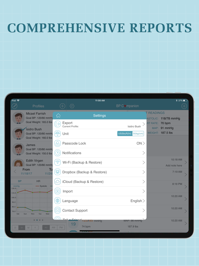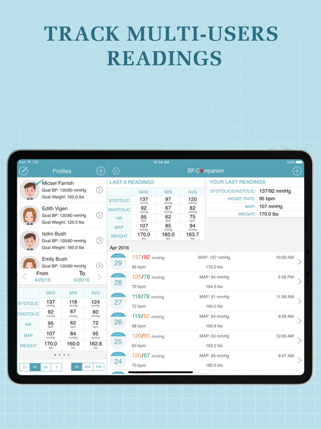 Blood Pressure Companion 는 혈압, 심박수 및 체중 추적기입니다.혈압을 기록하는 것은 건강을 유지하는 좋은 습관이다.고혈압은 흔히 볼 수 있는 병이자 다발병이다.유전, 음식 불균형, 비만, 운동 부족, 음주 등이 고혈압을 유발할 수 있다.Blood Pressure Companion 를 사용하여 혈압을 추적하고 텍스트, 차트 및 히스토그램을 통해 혈압을 면밀히 모니터링 할 수 있습니다.그것이 비정상적이라는 것을 알았을 때, 당신은 신속하게 행동을 취하여 원인을 찾아내고, 그것이 너무 높게 자라는 것을 방지할 수 있다.또한 이 앱을 통해 의사와 측정 결과를 쉽게 공유할 수 있습니다.주요 특징:- 혈압, 심박수, 체중 및 테스트 날짜를 쉽게 추가하고 편집할 수 있습니다.- 읽기 수에 주석을 추가합니다.- 차트를 통해 수축기압, 이완기압, 심박수 및 체중을 추적합니다.- 각 혈압 범위의 시간 및 백분율을 분석합니다.- 각 판독의 평균 동맥압(MAP)을 계산합니다.- 혈압, 의사 진료 또는 기타 모든 것을 측정하는 알림을 만듭니다.- 숫자 및 히스토그램을 통해 판독의 최대값, 최소값 및 평균을 표시합니다.- 측정 통계를 일, 주, 월 또는 연도별로 표시합니다.- 스냅샷을 사진에 저장합니다.- 읽기 자료를 CSV, HTML 또는 PDF 형식으로 내보내기(이메일)- 내보낼 판독의 사용자 정의 날짜 범위입니다.- 색상 범위를 사용자 정의합니다.- 암호 기능으로 정보를 보호합니다.- 암호로 Touch ID를 지원합니다.- 사용자와 가족의 혈압을 추적하는 다중 사용자 지원- 파운드와 킬로그램을 지탱하다.- 인터페이스가 간결하고 인간적이다.- WiFi 백업 및 복구 지원.- iCloud 백업 및 복구 지원(iCloud를 통해 장치 간 데이터 동기화- Dropbox 백업 및 복구 지원.- 응용 프로그램에서 데이터 인쇄를 지원합니다.- 데이터를 건강한 애플리케이션으로 전송할 수 있습니다.- 3D 터치 기능을 지원합니다.- Apple Watch 버전이 지원됩니다.질