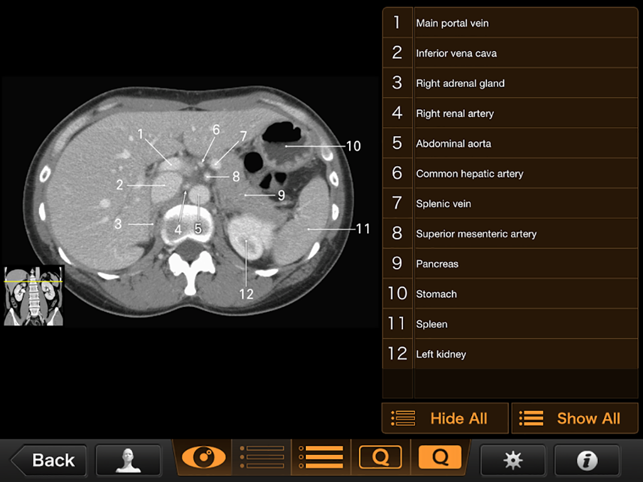 ◎ Details ◎-This application is developed for medical students, interns, residents, doctors, nurses, and radiology technicians to understand the essential anatomical terms of the body.-You can learn anatomy by answering the terms by step-to-step questions using a total of 241 CT and MRI images.-A total of 17 images of 3D-CT, MRA and plain X-ray film(particularly the extremities) are included as references.-Other reference images include coronary artery segments defined by the American Heart Association(AHA), pulmonary segments, and liver segments(according to Couinaud classification).-You can enlarge all the images by simple manipulation.◎ Major functions ◎ There are 4 major functions.-1) Anatomical modeAnatomical terms are overlaid on the images.It can be used as the anatomical atlas.-2) Quiz mode type 1You select the part of the image by using anatomical term.Questions will basically appear randomly.-3) Quiz mode type 2You select the anatomical term by the part of the image.Questions