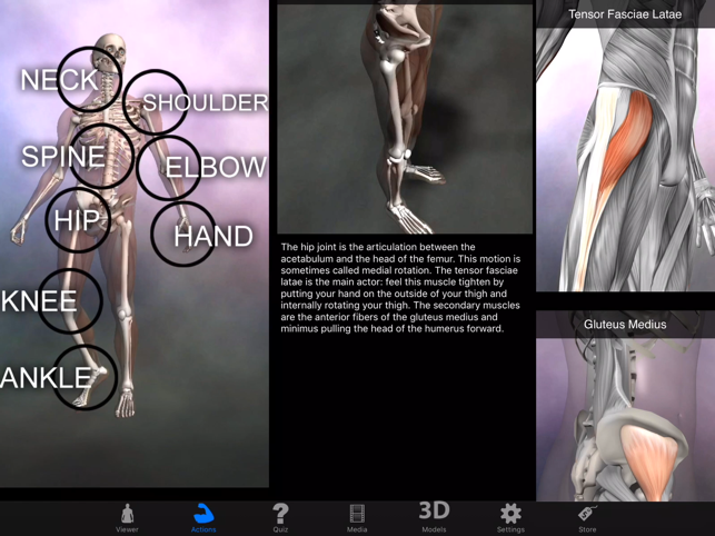 An amazing reference for anyone interested in the human musculo-skeletal system. Featuring five different ways to learn about the body: The VIEWER, ACTIONS, 3-D MODELS, nine types of QUIZZES, and the MEDIA section. VIEWER: The viewer allows you to control a 3D view of the body, with labels that lead to full screen images of 145 muscles each with the name, action, origin, insertion, nerve supply and comments for each muscle. The viewer also includes all the bones with detailed landmarks. ACTIONS: The best way to learn about muscles is to group them into their actions. In this section, choose from over 37 body actions, and see an animation of the action, with a visual list of muscles that perform that action, plus comments in each section. 3D MODELS: There are seven 3D models, each model allows you to control a body area in 3-D space, with multiple stops along the way that identifying the structures and give comments on each area. Models cover the ankle, knee, pelvis, shoulder, face, han