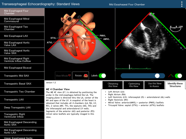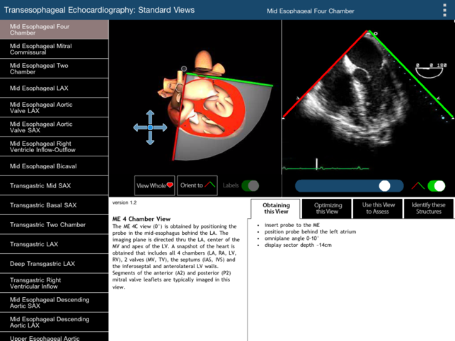 The primary challenge in learning transesophageal echocardiography (TEE) is translating the two dimensional echocardiographic image into a visualization of the three-dimensional (3D) structure of the heart. We have created this application to assist with teaching and learning the assessment of cardiac function with TEE. Users can view the TEE recordings for each of the 20 standard diagnostic views and see the corresponding 3D model of the heart, the TEE probe, and the ultrasound plane. Each TEE view can be selected from a menu at the left of the screen, or by using arrow buttons to go to the next or previous view in the list. For each TEE view, the 3D model of the heart, probe, ultrasound plane, heart can be rotated in the horizontal or vertical plane to view it from any angle. The part of the heart above the echo plane can be removed, and the heart model can be oriented so the structures correspond to the TEE image.
