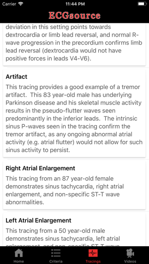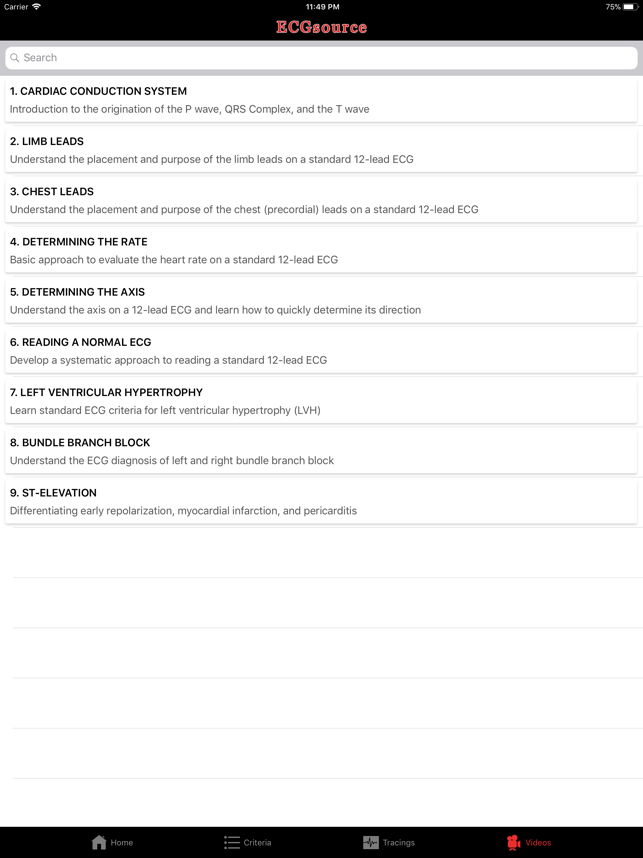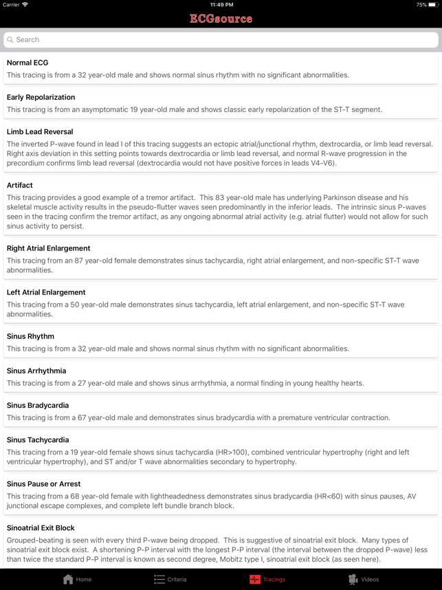 **Excellent resource for ECG Criteria and Board Review!**ECGsource (from the developers of the CathSource and EchoSource Apps) is a supplemental application to ECGsource.com, the largest online educational resource for electrocardiograms. ECGsource has been developed for medical education and board review, and assists institutions in documenting trainee competency in electrocardiogram (ECG) interpretation.ECGsource for the iPhone/iPad provides the following resources:-> Full-List of Searchable ECG Diagnoses and Criteria-> Over 65 High-Resolution Sample ECG Images-> ECG Quiz (5-question demo of website's full content)-> ECG Video Tutorials for Beginners (over 50 minutes of tutorial videos)**ECG Criteria is an easily searchable rapid reference for more than 90 of the most common ECG diagnoses, including: Normal ECG, Incorrect Electrode Placement, Artifact, Atrial Enlargement, Sinus Rhythm, Sinus Arrhythmia, Bradycardia, Tachycardia, Sinus Arrest, Sinoatrial Exit Block, A