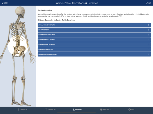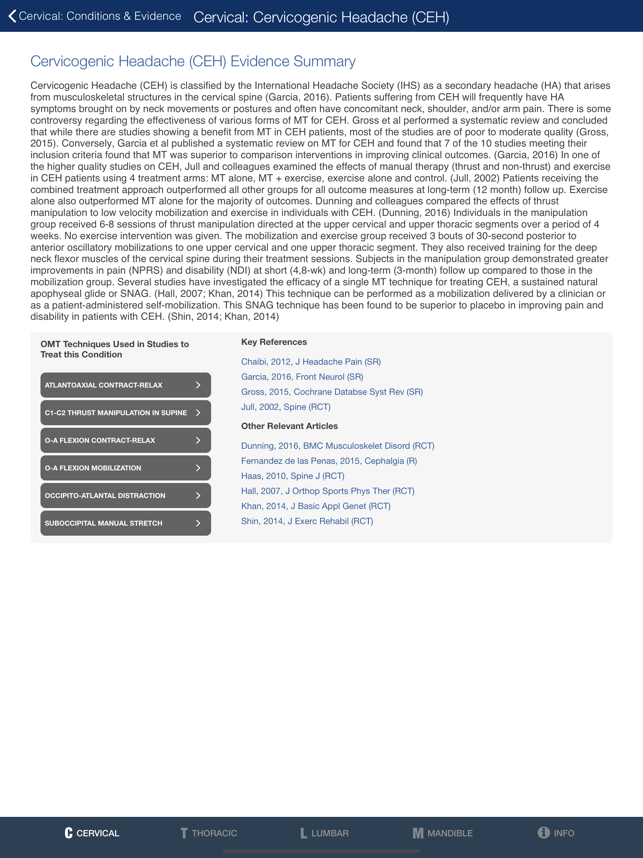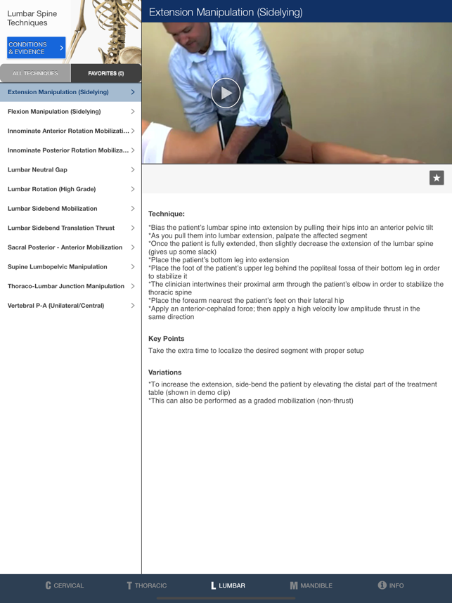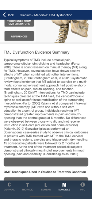 MOBILE OMT for the SPINE is a powerful clinical reference and teaching tool for any student, clinician or educator involved in the practice or the teaching of manipulative/manual therapy for musculoskeletal disorders. A comprehensive mobile companion providing manipulative techniques for the cervical, thoracic, and lumbar spine presented in the context of best current evidence for use in treating spine disorders. Step by step written instructions, high-quality video demonstration with audio, indications for use, and evidence to support each technique.Summaries of the most recent clinical research involving manipulative therapy are provided for each spine region (cervical, lumbar, and thoracic) with links to PUBmed abstracts of relevant clinical studies. Each technique is linked to a disorder, and also linked to the empirical study that has used that technique. Additionally a brief summary of the history of manipulative therapy is presented, as well as definitions of terminology.OM