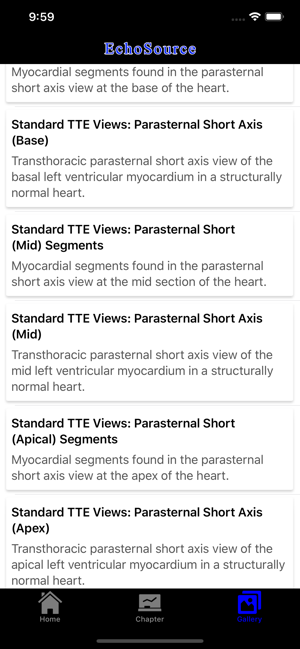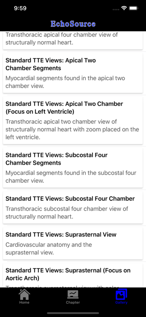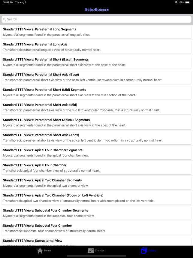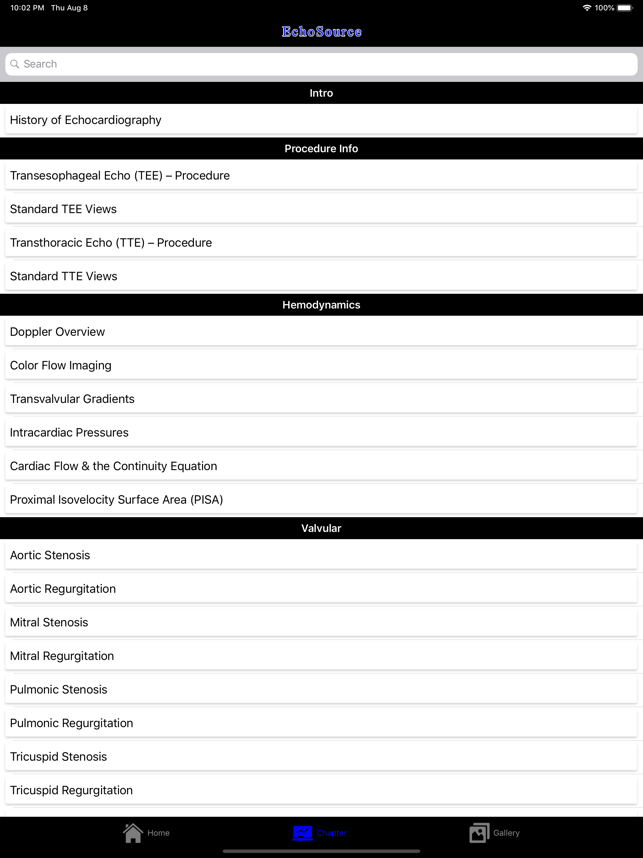 EchoSource (from the creators of ECGsource and CathSource) is a medical reference devoted exclusively to echocardiography. Developed by practicing cardiologists for both specialists and trainees in the field of cardiovascular disease, EchoSource offers the following content:* Searchable index of specialized topics including: History of EchocardiographyTransthoracic Echo – Learning the ProcedureTransesophageal Echo – Learning the ProcedureStandard Transthoracic Echocardiography ViewsStandard Transesophageal Echocardiography ViewsHemodynamics: Doppler OverviewHemodynamics: Color Flow ImagingHemodynamics: Transvalvular GradientsHemodynamics: Intracardiac PressuresHemodynamics: Cardiac Flow & the Continuity EquationHemodynamics: Proximal Isovelocity Surface Area (PISA)Left Ventricle: Systolic FunctionLeft Ventricle: Diastolic Function Valvular: Aortic StenosisValvular: Aortic RegurgitationValvular: Mitral StenosisValvular: Mitral RegurgitationValvular: Pulmonic StenosisValvular: P