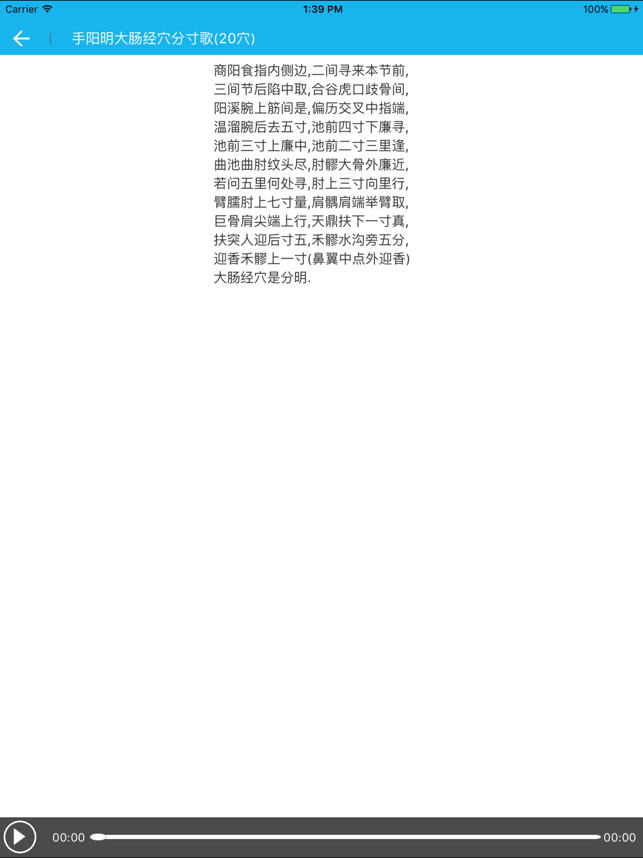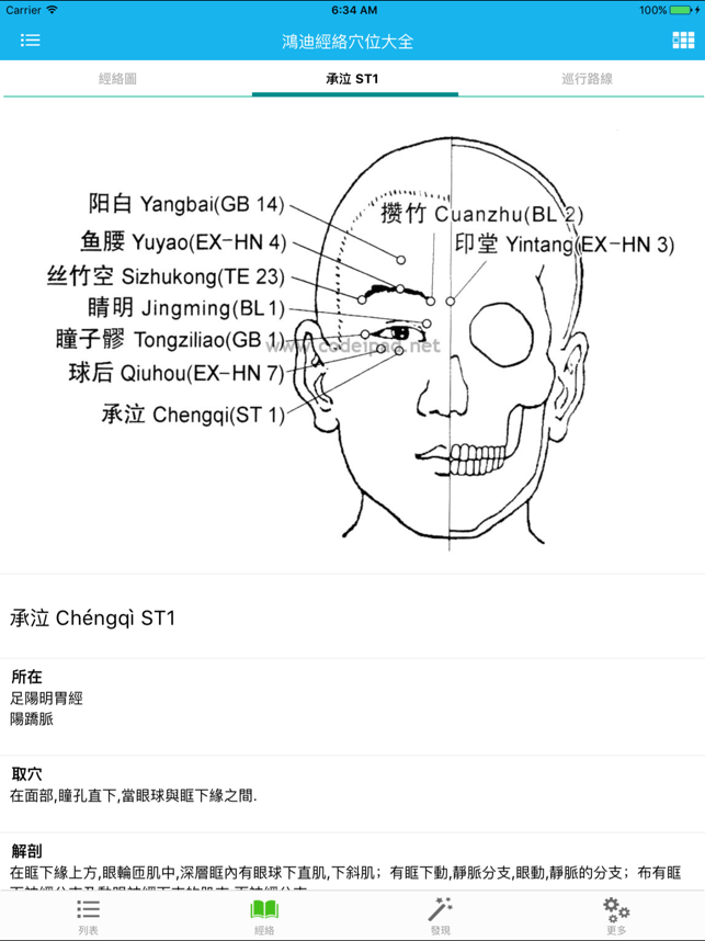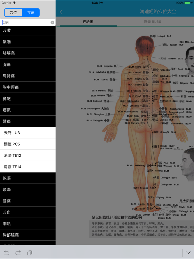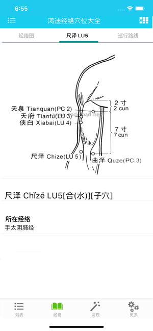 这是一个经典的中医经络学习软件和临床医生的工具软件,适合于中医学院的教师、学生、医务工作者、按摩师、注重养生保健的人士。1、根据国家标准收录20条经脉(12条正经+8条脉)的穴位和经外奇穴(头面颈、躯干部和手、足部),包含经络的属性、主治范围和经络的当令时辰等信息。2、支持显示12条正经和8条脉的循行路线图。3、详细说明了408个穴位的注音、定位方法和定位图、主治范围、解剖原理、配伍、针灸方法、附注。4、说明了每个经络的五输穴井荥输经合、母穴、子穴、原穴、俞穴、募穴、郄穴。5、可以根据穴位关键词搜索、也可以根据疾病搜索相关的穴位。6、可以显示当前的当令经络。7、具有经络的相关口诀,并有语音朗读(女声),方便记忆。8、动态显示巡行路线,并有语音朗读。9、具有针灸姿势的图文说明。10、支持iOS8.0及以上操作系统网站支持 http://www.codeipad.net