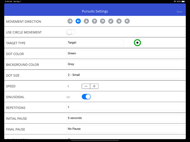 Focus Builder is optimized for use on an iPad.Eye movements are a very powerful way to exercise the brain and to create long-term change in the brain, known as plasticity. The “Focus Builder” app contains a variety of exercises which challenge users to voluntarily move their eyes in various patterns, speeds and directions, which have been proven to activate specific parts of the brain depending on which eye movement is performed.This app is specifically designed for doctors that specialize in Functional Neurology and their patients. There is currently no app available that can provide these specific exercises. For best results, patients should consult a Functional Neurologist to determine how to use this app according to their needs and obtain the most therapeutic value.There are 3 types of eye movements that can have profound therapeutic benefits and all three are available in this app. 1.Pursuits (slow eye movements): Smooth pursuit eye movements allow the eyes to closely follow