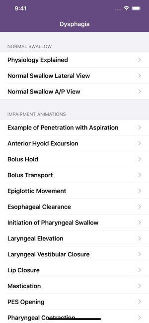 Excellent visual tool to aid professionals in educating patients and families about swallowing disorders. This app features custom-designed animations derived from MBSImP™ research on swallowing physiology and impairment. The animations accurately depict normal swallow physiology and provide clear examples of varying physiologic impairments of the swallow. Controls allow for zoom, slow motion, pause, and frame-by-frame scroll. Includes an overview of normal swallow function, and links to other educational resources. Animations are of adult physiology and include:• Normal Swallow, Lateral View• Normal Swallow, A/P View• Example of Penetration with Aspiration• Impairment of Anterior Hyoid Excursion• Impairment of Bolus Hold • Impairment of Bolus Transport• Impairment of Epiglottic Movement• Impairment of Esophageal Clearance• Impairment of Initiation of Pharyngeal Swallow• Impairment of Laryngeal Elevation• Impairment of Laryngeal Vestibular Closure• Impairment of Lip Closure• Impairment