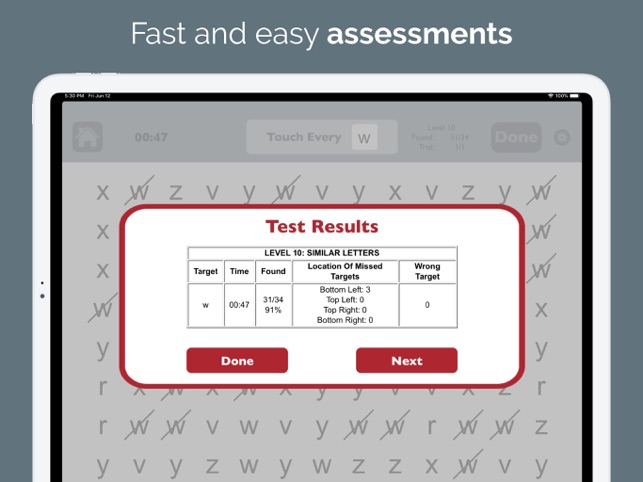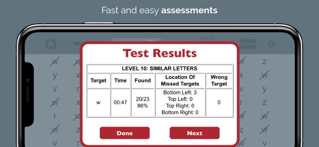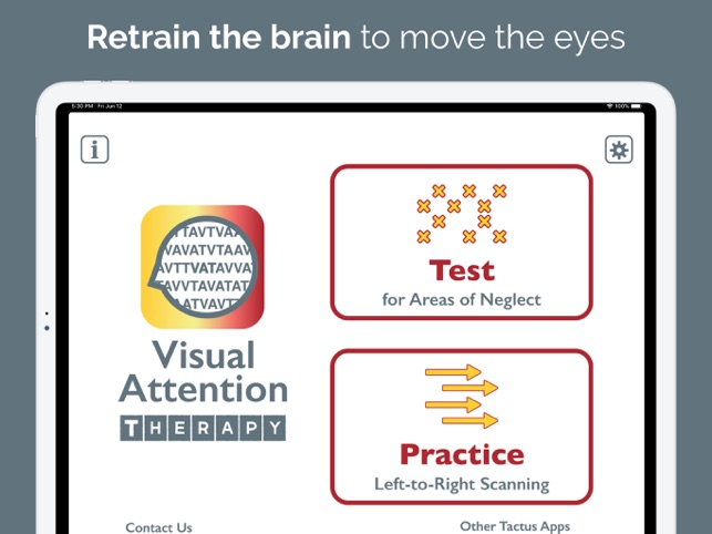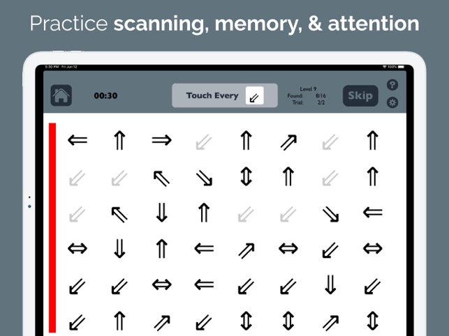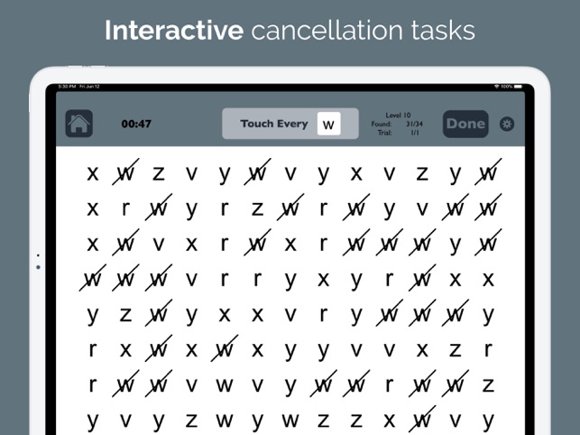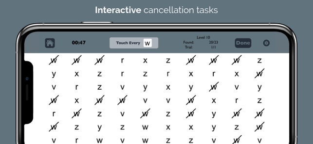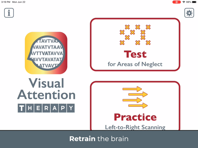 RETRAIN THE BRAIN to move the eyes correctly by scanning from left to right across the screen. Strengthening this essential skill can improve reading, concentration, memory, attention to detail, and speed of processing. TWO POWERFUL MODES help brain injury and stroke survivors with left neglect improve at home while also helping occupational therapy (OT) and speech therapy (SLP) professionals to efficiently assess for right or left neglect and provide more effective treatment.* Use the Test mode to determine if and where a visual attention deficit exists.* Use the Practice mode to train scanning by finding targets in order.++ SEE HOW IT CAN HELP – Download Visual Attention Therapy Lite for FREE! ++-----------CANCELLATION TASKS JUST GOT BETTER. This professional cognitive training app takes a familiar format for treating left neglect and transforms it into a dynamic, interactive tool for all ages. Visual Attention Therapy offers benefits that can only be achieved through technology: * T