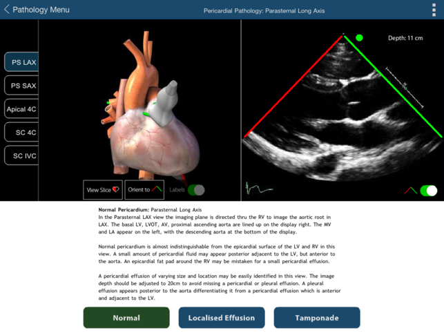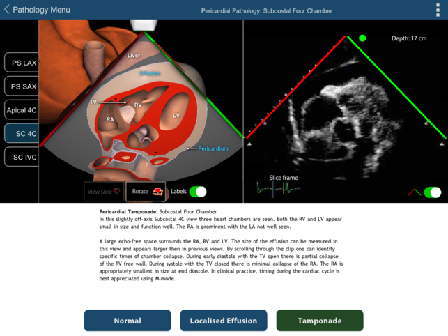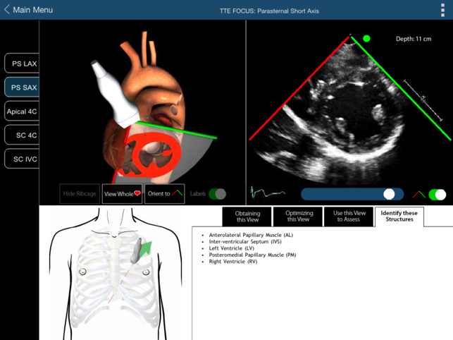 In the practice of anesthesia, critical care and emergency medicine there is often a need for a quick, qualitative assessment of cardiac function. Focused Cardiac Ultrasound (FOCUS) is the process of carrying out this rapid qualitative assessment by practitioners in these fields. Training for carrying out a FOCUS assessment requires practitioners to understand the 3D structures of the heart that are seen in the 2D transthoracic echocardiography (TTE) image.We have created this interactive application to assist with teaching and learning the assessment of normal and pathologic cardiac function with FOCUS. FOCUS assessments are based on a subset of 5 of the 20 standard TTE views:Parasternal long axisParasternal short axisApical four chamberSubcostal four chamberSubcostal inferior vena cavaUsers can view the TTE recordings for each of the 5 FOCUS views and see a corresponding 3D model of the probe, ultrasound plane, heart and rib cage for each view. Each FOCUS view can be selected from a