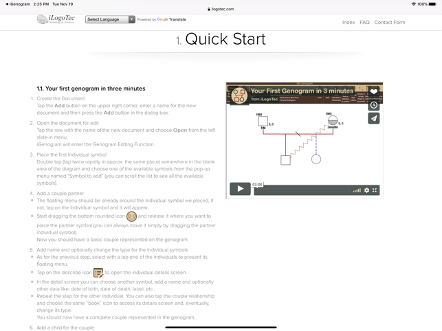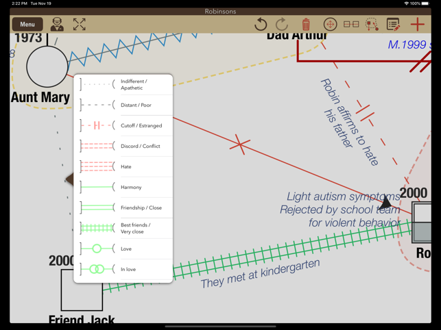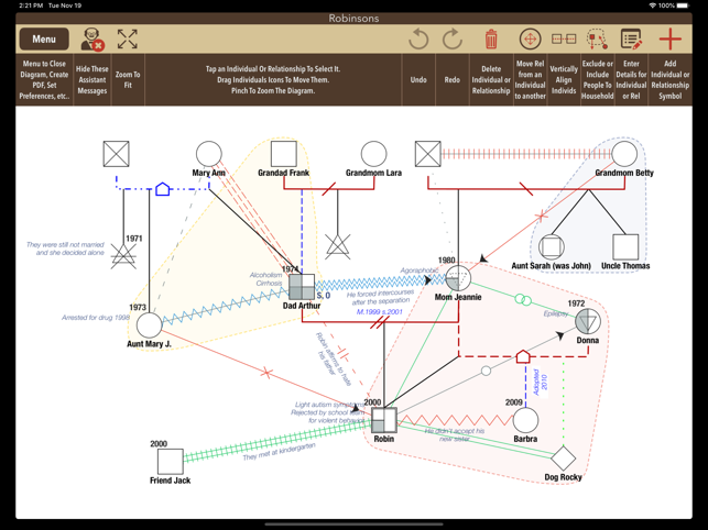 iGenogram is an iPad app designed to draw beautiful genograms with no graphical effort.Genograms are extremely powerful tools for any LCSW (Licensed Clinical Social Worker), MFT (Marriage and Family Therapist), Relationships Counselor, Psychologist, Psychiatrist and AP Psychology student. In CBT (Cognitive Behavioral Therapy), genograms of extended family systems are successfully used, both diagnostically and therapeutically, to uncover important information about a person history and family of origin.Genograms are used in many fields from marriage counseling to novel writing. However, a lot of time and some talent for drawing is essential to produce neat, professional and understandable diagrams. Moreover, additional efforts are needed to organize notes collected during analysis and counseling interviews.With iGenogram, you can easily draw and update genograms using many predefined symbols for: Individuals, Couples, Child-Parents ties, Emotional relationships between individuals and r