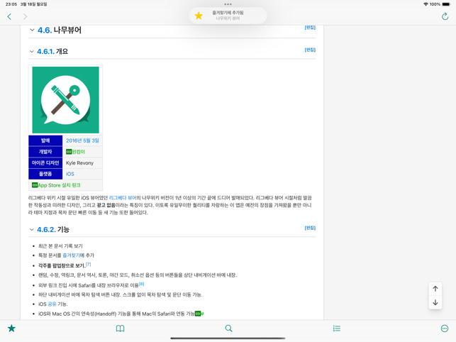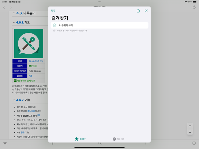 앱 내 광고 없음! 나무위키 사이트의 광고 차단까지!깔끔한 디자인의 나무위키 뷰어를 사용해보세요.- 나무위키 광고를 차단할 수 있습니다.- 자주 읽는 문서를 즐겨찾기에 추가할 수 있습니다.- 문서 내 목차를 스크롤을 올리지 않고 바로 확인할 수 있습니다.- 깔끔한 디자인과 다크 모드를 포함한 여러가지 테마를 지원합니다.- 홈 화면 앱 아이콘을 길게 눌러 바로 랜덤 문서로 이동할 수 있습니다.- 외부 웹 페이지를 앱 안에서 볼 수 있습니다.- 블루투스 키보드 단축키를 지원합니다.- URL Scheme를 지원합니다.* 이 앱은 나무위키 공식 앱이 아닙니다.* 오프라인 뷰어는 지원하지 않습니다.