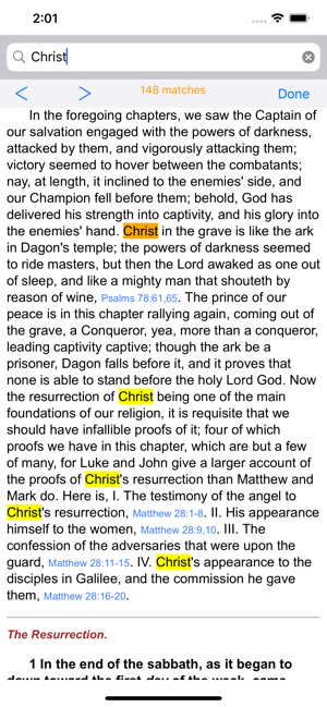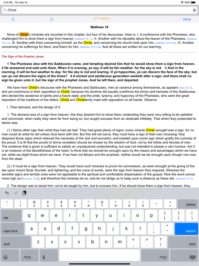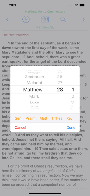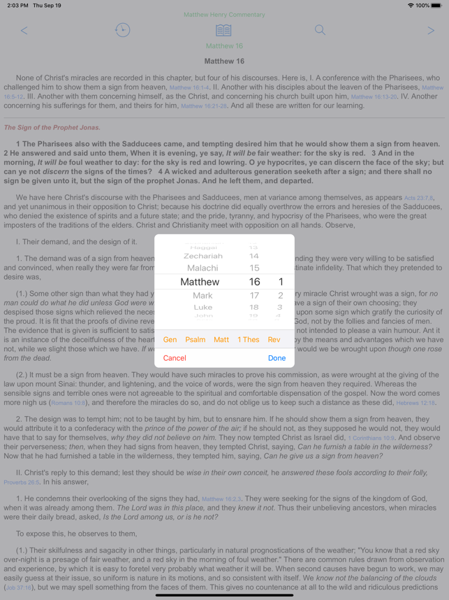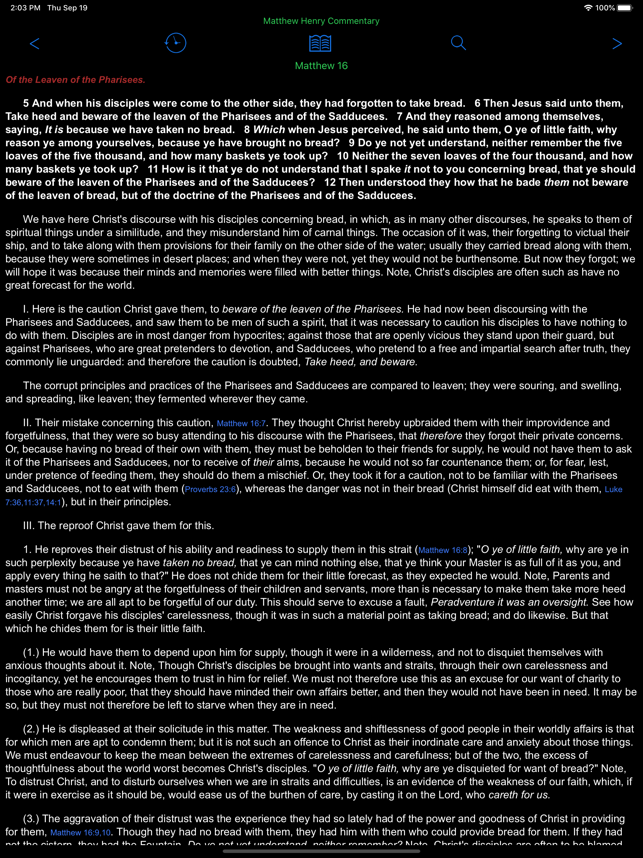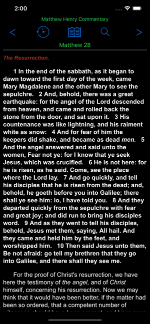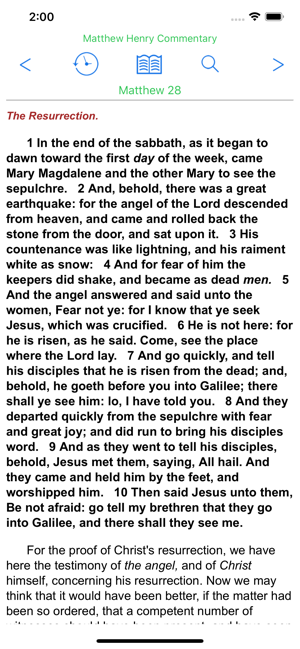 The complete six volume set (over 5,850 pages) of trusted verse-by-verse commentary of the entire holy bible with over 64,000 scripture references at your finger tips - fast and easy to use.The complete Matthew Henry Commentary in 6 volumes is contained entirely on your iPad/iPhone/iPod Touch along with all reference scripture texts (KJV translation), no wireless connection needed.Designed to be fast and easy to use, the controls are very simple; touch the left or right arrows to go back/forward a chapter at a time. Touch the book icon to bring up the list of all books, chapters and verses to quickly jump there. Touch a blue scripture reference and those scriptures will be instantly displayed. Features:- Self-contained no wireless connection needed.- Fast and easy to use.- Remembers your location on exit so you return to where you last left off.- Scripture references included (KJV translation)- Supports landscape and portrait viewing modes- Keeps history of chapters to easy backtrack-
