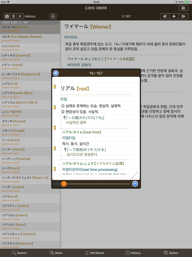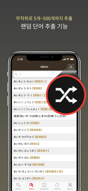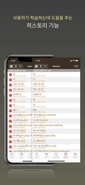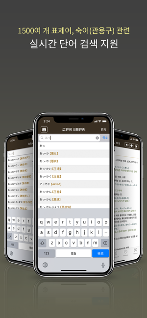 앱 스토어 최초! 일본의 국민 사전 일일 고지엔 사전이 일한 고지엔 사전으로 번역 출시!! 고지엔 일한 사전의 특징I. 서적일본 최고의 국어(일본어) 사전 고지엔 사전 6판(이와나미 출판사)이 일한 고지엔 사전으로 번역 출시되었습니다.일본에서 1100만 명에 가까운 독자를 확보한 국민적 사전인 고지엔 사전의 최신 개정 6판은 변화하는 일본어에 맞춰 내용을 개정하고, 각종 생활 지식에서 최신 시사, 경제 용어, 가타가나어, 외래어 등의 신어를 풍부하게 반영하여 수록하고 있습니다.메이지 시대 이후의 작품으로부터 1500여 용례를 새롭게 게재하고, 속담, 4자 성어도 보강, 수록되어 있습니다.일일 고지엔 사전 최신 개정 6판을 그대로 옮긴 일한 고지엔 사전은 일본어에 대한 가장 자연스런 일본어 뜻 풀이를 한국어로도 쉽게 학습 할 수 있도록 만들어졌습니다.II. Program1. 표제어 실시간 검색기능 지원2. 숙어(관용구) 실시간 검색기능 지원3. 다중 단어장 기능 지원4. 최근 검색어 History 기능 지원5. 플래시 카드 기능 지원6. 퀴즈 기능 지원7. 단어장 및 숙어장 백업 지원개발•판매: 다올소프트
