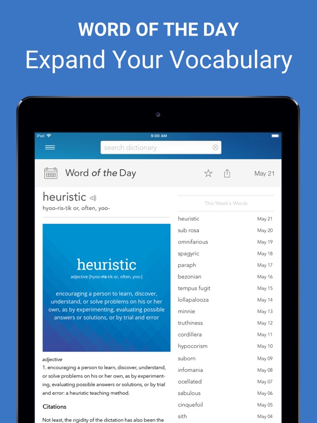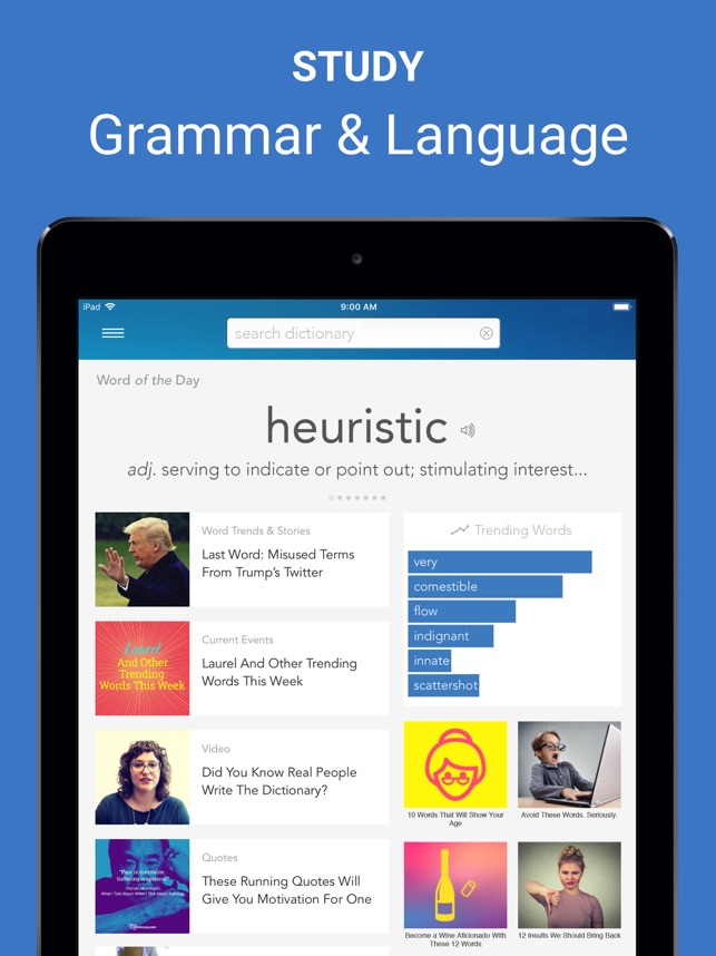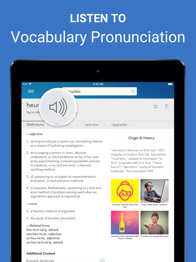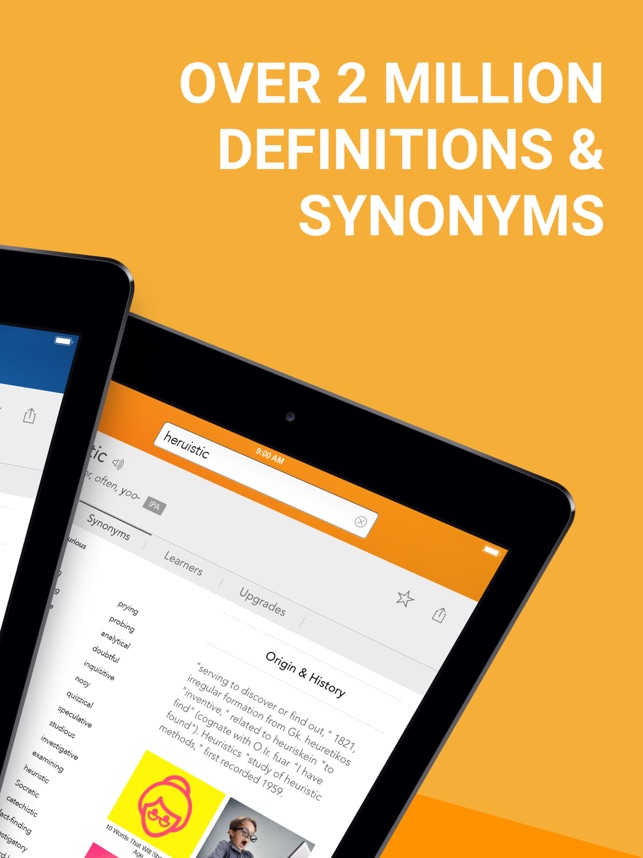 Dictionary.com & Thesaurus.com에서 신뢰 참조 함량이 높은 평가를받은 앱. 오프라인 작품 - 단어를 검색 할 때 인터넷 연결이 필요하지 않습니다. * * 애플의 아이 패드에 대한 상위 25 모든 시간 최고의 애플 '특징 :* 영어 사전 및 유의어 사전 - 2,000,000 정의, 동의어 및 반의어* 오프라인 액세스 - 대부분의 콘텐츠에 필요한 인터넷 연결 없음오늘의 말씀, 뜨거운 말씀과 슬라이드 쇼를 포함 * 일일 컨텐츠500,000 운율 * 운이 맞는 사전 - 업그레이드를 사용할 수35,000 정의와 * - 의학 사전, 의학 용어 업그레이드를 사용할 수23,000 정의 및 삽화와 함께 * 과학 사전 - 업그레이드를 사용할 수*인기 일일 내용으로 슬라이드 쇼 갤러리*새로운 프리미엄 콘텐츠 : 인 - 앱 구매로 사용할 속어 사전, 숙어 및 구문 및 문법 팁* 오디오 발음* 예제 문장* 좋아하는 말* 검색 기록* 맞춤법 제안* 풍경 모드 : 스크롤 사전 순으로팁 : on 또는 off 일 알림의 말씀을 설정하려면, 설정> 알림> 사전> 알림으로 이동하여 On 또는 Off를 전환합니다.이 무료 사전 앱은 앱에서 구매 및 소셜 미디어를 통해 콘텐츠를 공유 할 수있는 옵션, 광고를 포함하고 있습니다.개인 정보 보호 정책 : http://dictionary.reference.com/help/privacy.html
