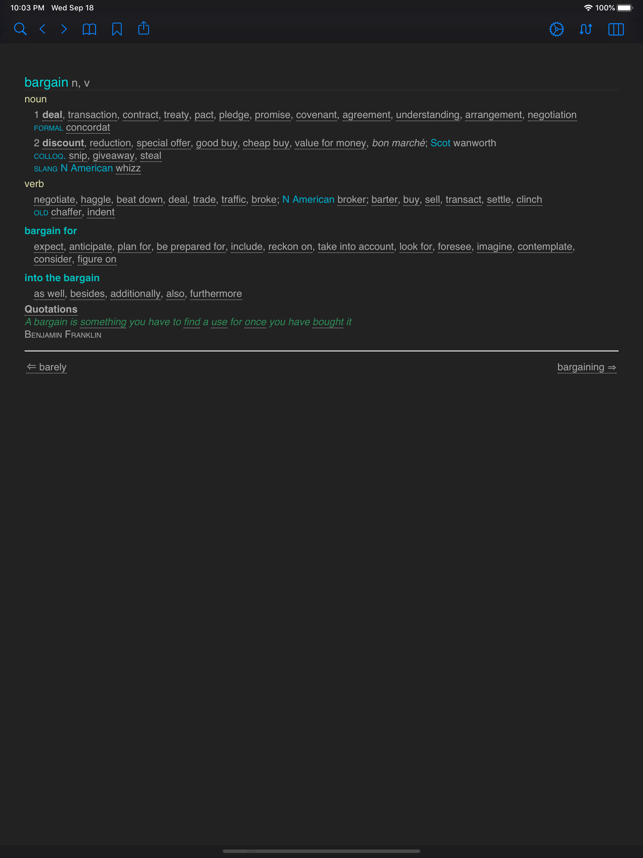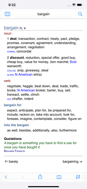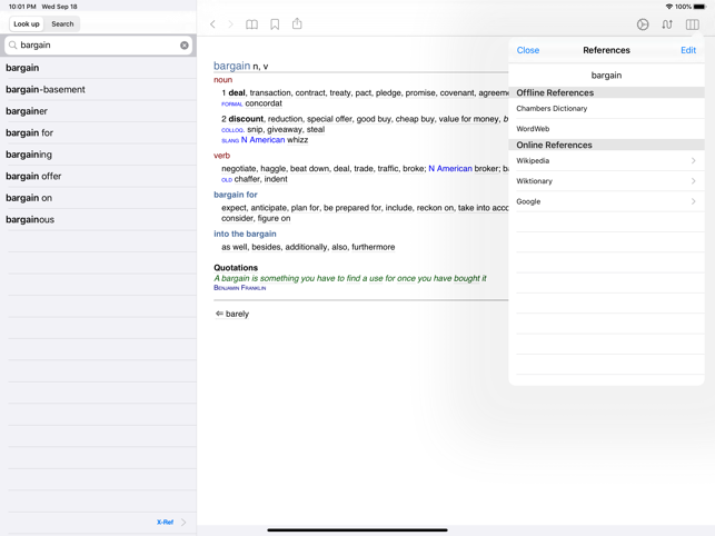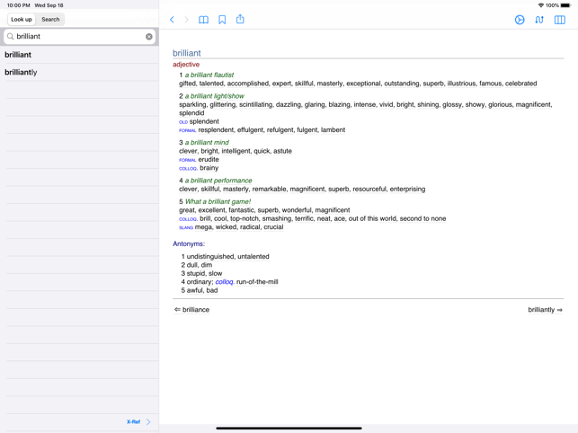 The Chambers Thesaurus is the perfect reference for writers and word game enthusiasts, while all lovers of language will find it a pleasure to browse through. There are nearly 40 000 distinct indexed words, and a total of about 400 000 synonyms and antonyms.The intelligent word entry suggests possible correct spellings as you type, as well as listing words that sound the same or are often confused. Search features include: - Alphabetical listing - Spelling suggestions - Sounds-like and often-confused - Fast pattern-matching search - Cross-reference to offline and online dictionariesThere are also standard bookmark, recent word and random word features. On newer iPads it supports Split View and Slide Over for easily viewing with other apps. With iOS 13+ it supports dark mode. No Internet connection is required. The Chambers Dictionary is also available as a separate app, and can easily be cross-referenced using the X-Ref button.Our WordWeb, Chambers and Oxford dictionaries are also ava