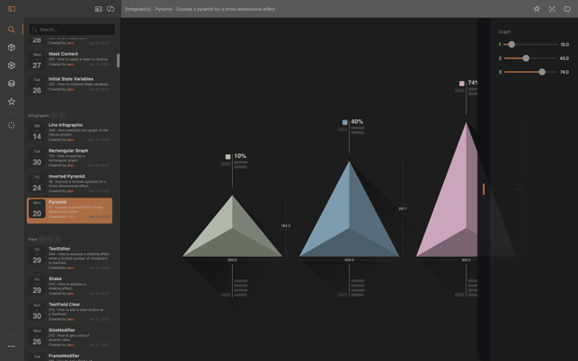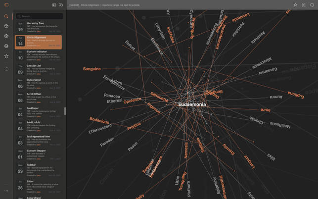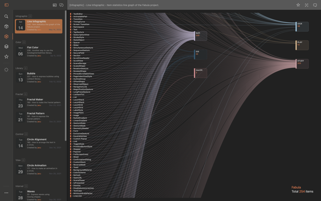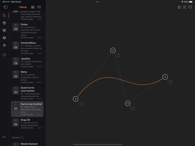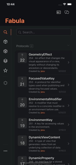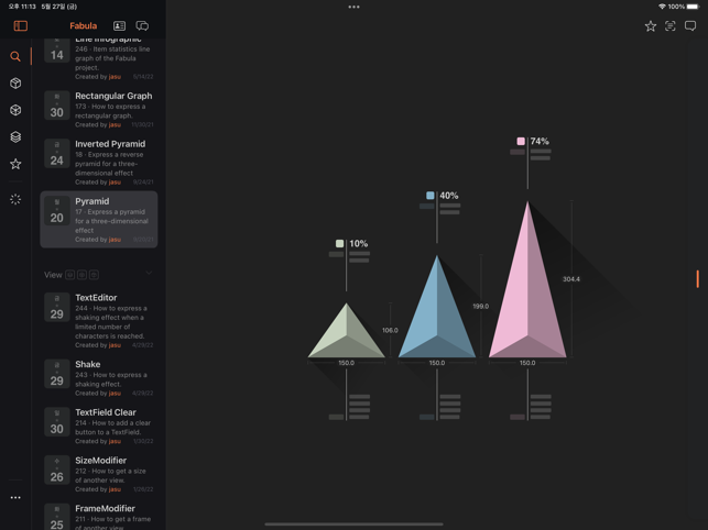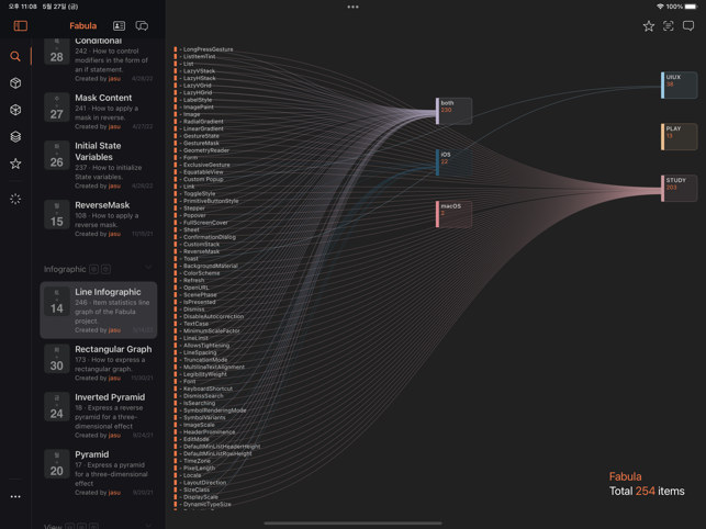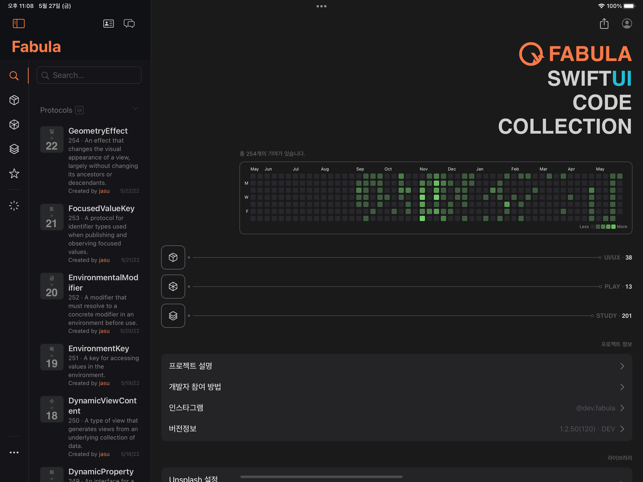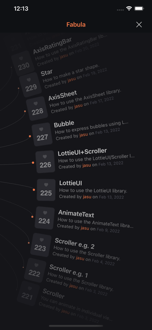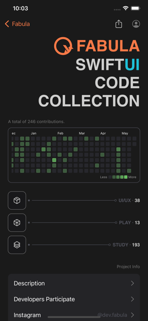 형식주의자들은 문학적인 전개법으로 파불라(fabula)와 슈제트(syuzhet)라는 개념을 사용했습니다. 재료와 구성을 각각 파불라와 슈제트로 분류하기도 했습니다. 인과 관계로 나열된 미세한 사건들의 총체를 파불라라하고, 이러한 모티브(motif)의 총체가 서술에 의해서 예술적으로 배열된 것을 슈제트라고 불렀습니다. 이 앱은 SwiftUI의 기술적인 재료들을 학습하고 창의적인 결과물을 도출하기 위한 프로젝트입니다. SwiftUI는 애플리케이션을 선언적 방식으로 개발할 수 있는 툴킷입니다. 화면을 구성하는 레이아웃의 복잡한 세부사항을 직접 설계하는 대신 사용자 인터페이스가 어떤 모양이어야 하는지를 선언하는 방식으로 개발하는 효율적이고 현대적인 개발 방식입니다. 또한 SwiftUI는 iOS뿐만 아니라 macOS, watchOS 및 tvOS를 사용하는 디바이스에 동일 코드로 인터페이스를 개발할 수 있습니다. 무엇보다도 매력적인 것은 배우기 쉽고 코드가 간결하여 초보 개발자도 이해하기 쉽다는 것입니다. 아무쪼록 본 프로젝트를 통해서 저를 포함하여 모든 분들이 SwiftUI를 이해하는 데 도움이 되기를 바랍니다. 본 프로젝트의 아이템들은 주기적으로 업데이트 됩니다.Fabula 앱에서는 전 세계 개발자들과 사용자들이 코드를 공유하고 소통할 수 있습니다. Fabula에서는 언제나 개발자들의 참여를 기다립니다.