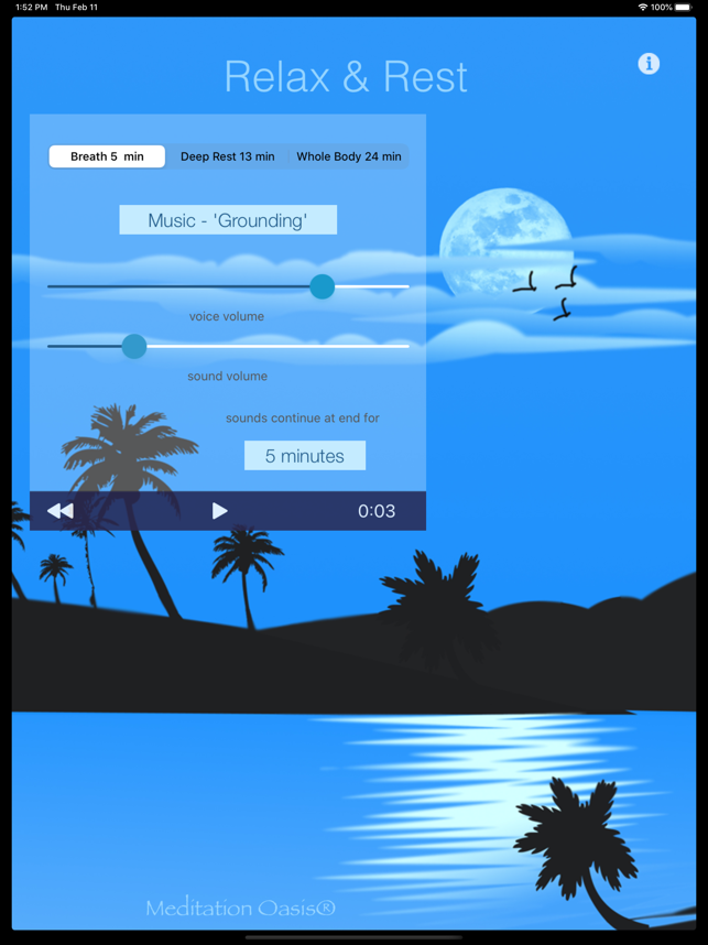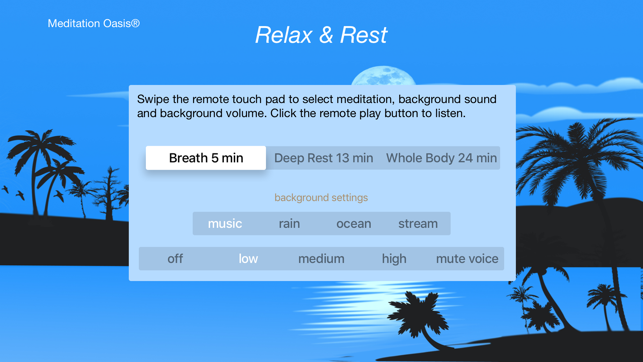 Enjoy the deep relaxation, stress relief and benefits of meditation with the Meditation Oasis® Relax & Rest app. Chosen for "Best Sleep Apps of 2014" and "Best Anxiety Apps of 2014" by healthline.com. **Now with new high quality nature sounds from Emmy Award-winning nature recordist Gordon Hempton.** Three meditations of varying lengths allow you to relax deeply regardless of how much time you have available. Written Meditation Tips help support your experience with the guided meditations. No previous meditation experience is required.-- Breath Awareness Guided Meditation (5 min) - to get centered and relaxed when you only have time for a short break. -- Deep Rest Guided Meditation (13 min) - allows you to sink into a deeply restful state. Many people use this meditation for falling asleep.-- Whole Body Guided Relaxation (24 min) - Relax totally and completely with this meditation which helps you locate tension in every part of the body, and let it go.Each medit